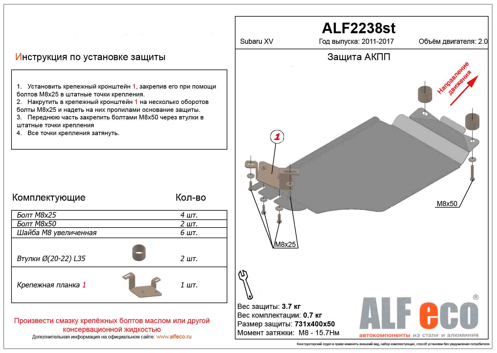 Защита АКПП Subaru XV (GP) 2011-2017 V-2,0 , ALFeco, сталь 2мм, арт. ALF2238st