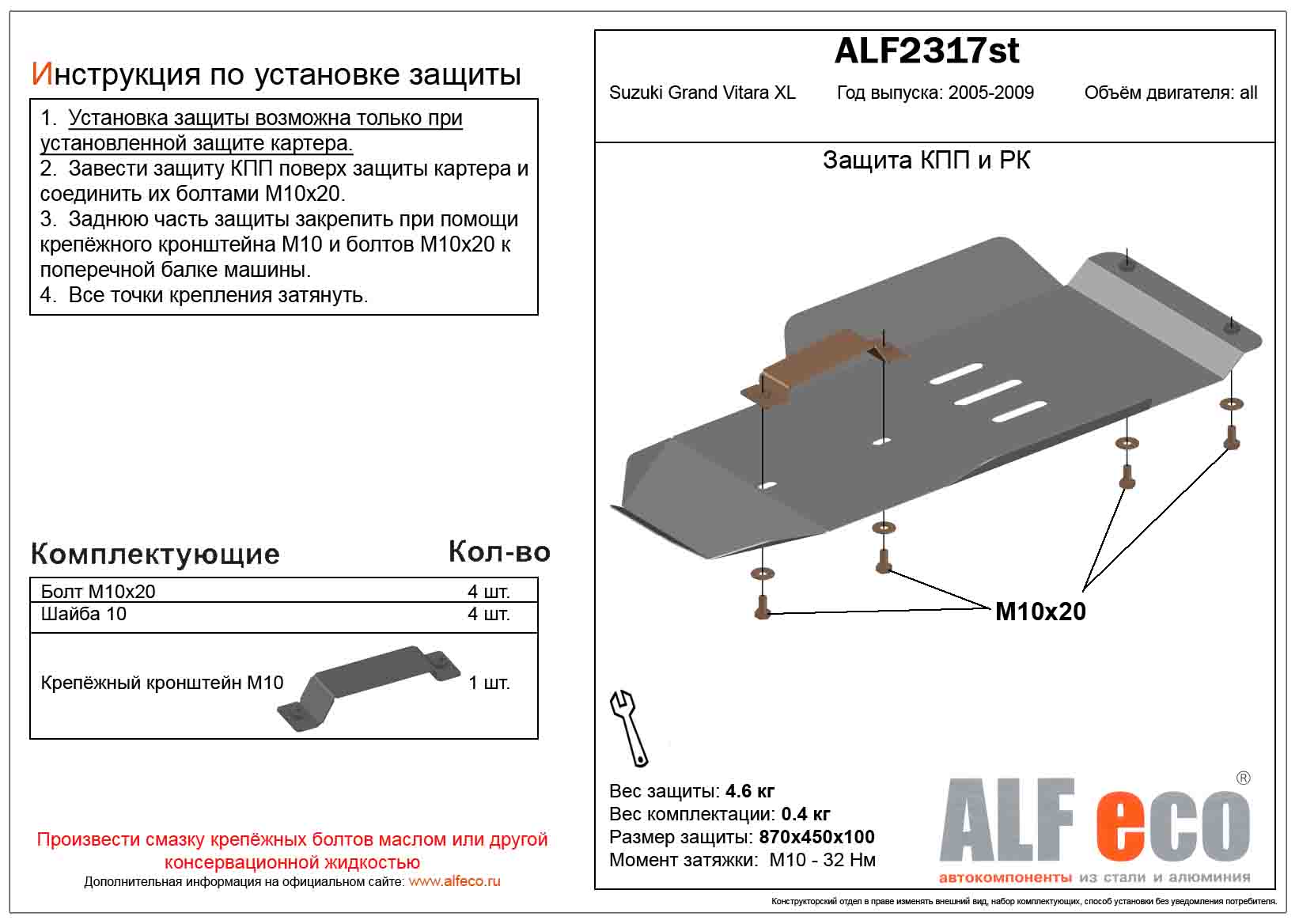 Защита КПП и РК (установка невозможна без ALF2318st) ALFeco арт. ALF2317al изготовлена из алюминия толщиной 4мм специально для автомобиля Suzuki XL7 2006-2009. Обеспечивает надежную защиту агрегатов от механических повреждений и попадания дорожной грязи и других предметов, встречающихся на проезжей части, способных зачастую нанести серьезный вред автомобилю. В комплекте идет весь необходимый крепеж для установки. Наличие можно уточнить по телефону. Возможна установка в нашем автосервисе по предварительной записи