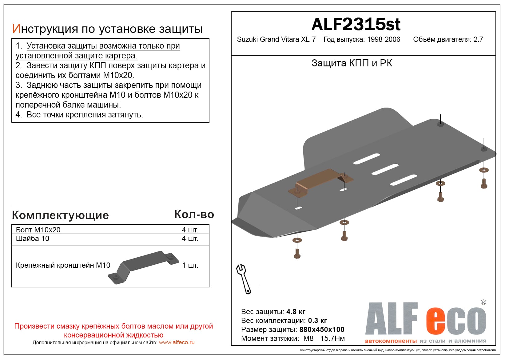 Защита КПП и РК (установка невозможна без ALF2312st) ALFeco арт. ALF2315st изготовлена из стали толщиной 2мм специально для автомобиля Suzuki Grand Vitara XL-7 2000-2006. Обеспечивает надежную защиту агрегатов от механических повреждений и попадания дорожной грязи и других предметов, встречающихся на проезжей части, способных зачастую нанести серьезный вред автомобилю. В комплекте идет весь необходимый крепеж для установки. Наличие можно уточнить по телефону. Возможна установка в нашем автосервисе по предварительной записи