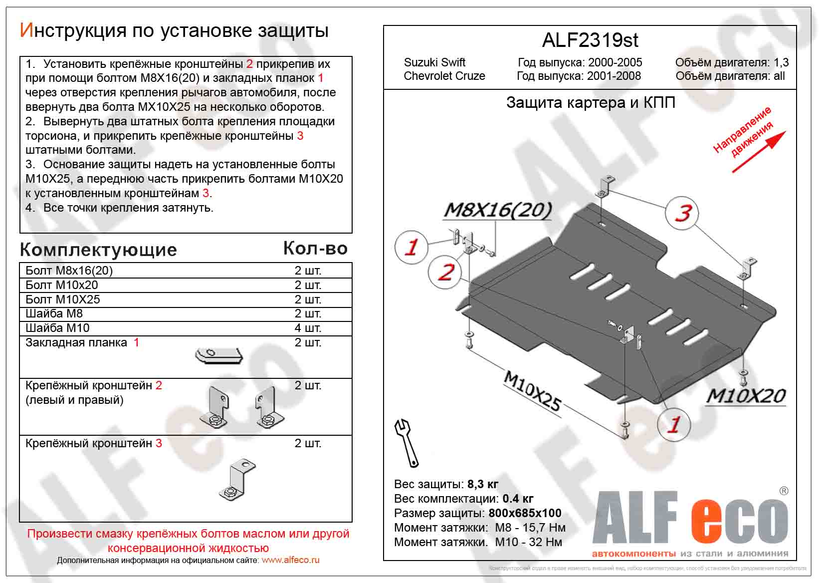 Защита картера и КПП (правый руль) ALFeco арт. ALF2319st-1 изготовлена из стали толщиной 2мм специально для автомобиля Suzuki Swift 2000-2005. Обеспечивает надежную защиту агрегатов от механических повреждений и попадания дорожной грязи и других предметов, встречающихся на проезжей части, способных зачастую нанести серьезный вред автомобилю. В комплекте идет весь необходимый крепеж для установки. Наличие можно уточнить по телефону. Возможна установка в нашем автосервисе по предварительной записи