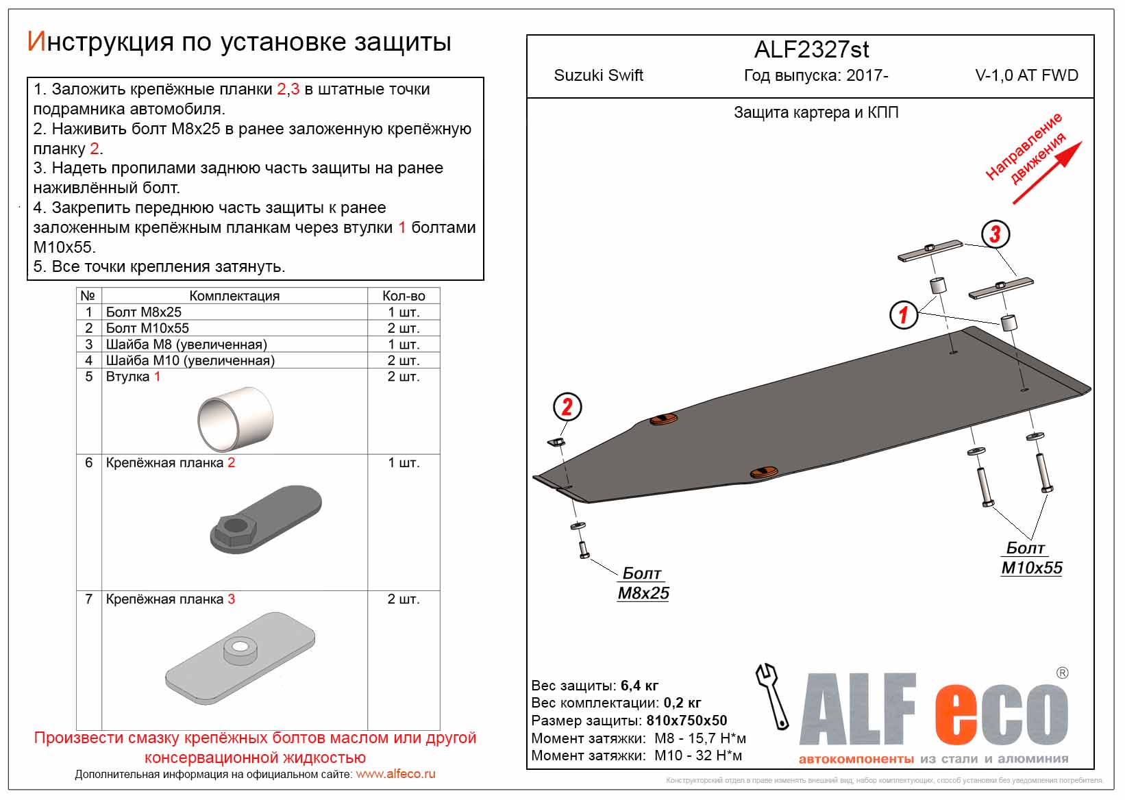 Защита картера и КПП ALFeco арт. ALF2327st изготовлена из стали толщиной 2мм специально для автомобиля Suzuki Swift 2017-. Обеспечивает надежную защиту агрегатов от механических повреждений и попадания дорожной грязи и других предметов, встречающихся на проезжей части, способных зачастую нанести серьезный вред автомобилю. В комплекте идет весь необходимый крепеж для установки. Срок поставки защиты составляет 1-3 дня, наличие можно уточнить по телефону. Возможна установка в нашем автосервисе по предварительной записи