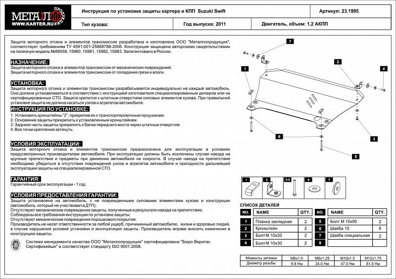 Приобретая стальную защиту 23.1995 для SUZUKI Swift 2011 - 2017, вы можете установить ее в нашем сервисе. Стоимость установки от 1100 рублей за лист, предварительно необходимо записаться по телефону на удобное для вас время.