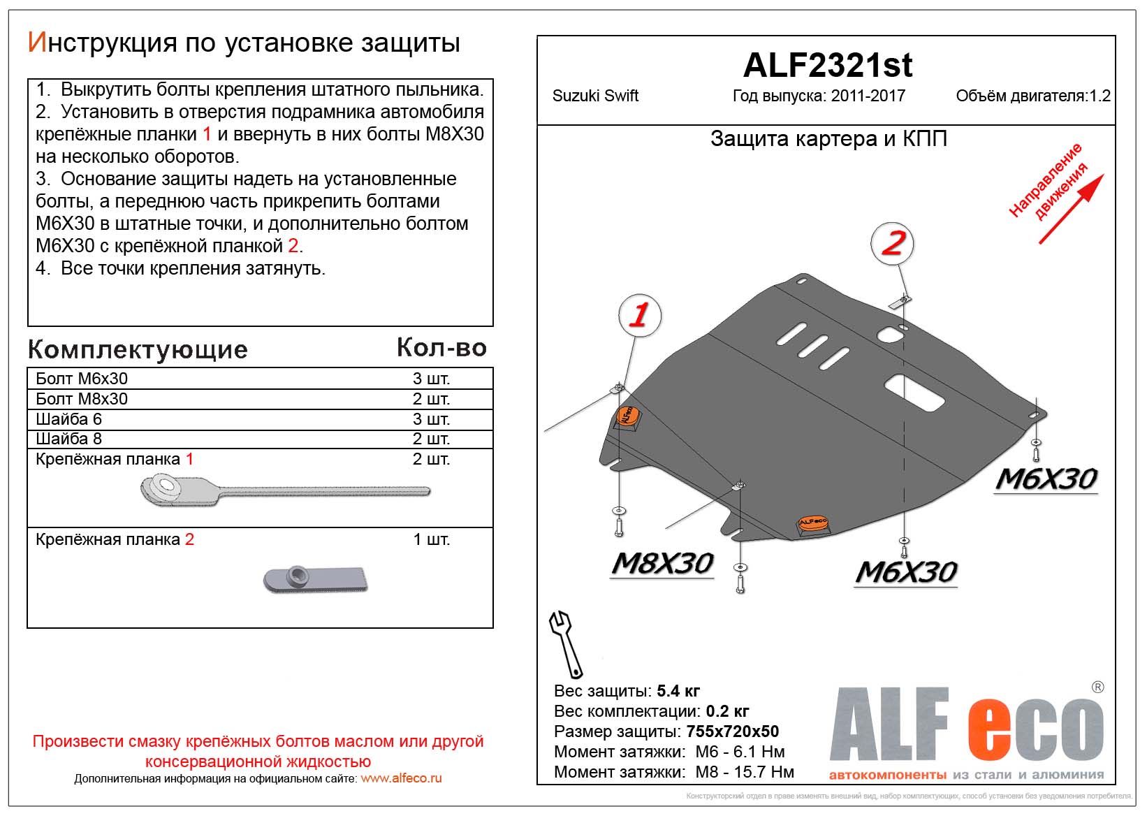 Защита картера и КПП ALFeco арт. ALF2321al изготовлена из алюминия толщиной 4мм специально для автомобиля Suzuki Swift 2011-2017. Обеспечивает надежную защиту агрегатов от механических повреждений и попадания дорожной грязи и других предметов, встречающихся на проезжей части, способных зачастую нанести серьезный вред автомобилю. В комплекте идет весь необходимый крепеж для установки. Наличие можно уточнить по телефону. Возможна установка в нашем автосервисе по предварительной записи