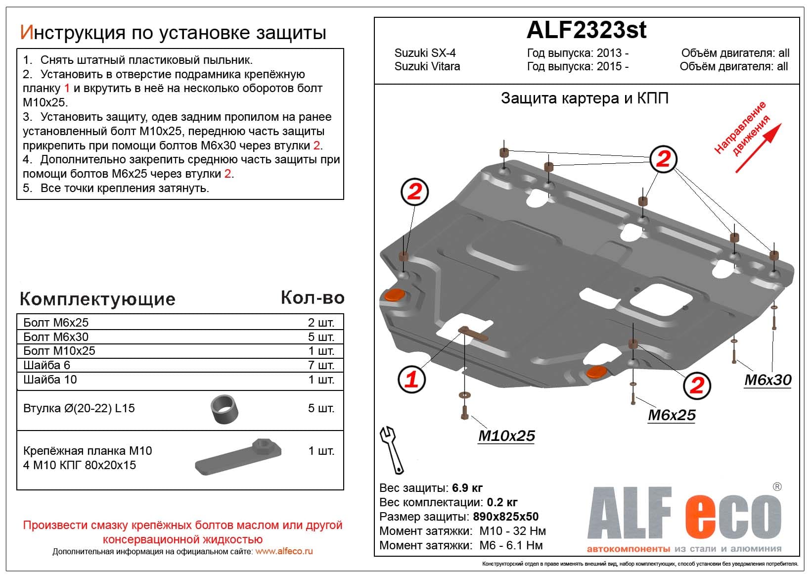 Защита картера и КПП ALFeco арт. ALF2323al изготовлена из алюминия толщиной 4мм специально для автомобиля Suzuki SX4 (NEW) 2013-2021. Обеспечивает надежную защиту агрегатов от механических повреждений и попадания дорожной грязи и других предметов, встречающихся на проезжей части, способных зачастую нанести серьезный вред автомобилю. В комплекте идет весь необходимый крепеж для установки. Наличие можно уточнить по телефону. Возможна установка в нашем автосервисе по предварительной записи
