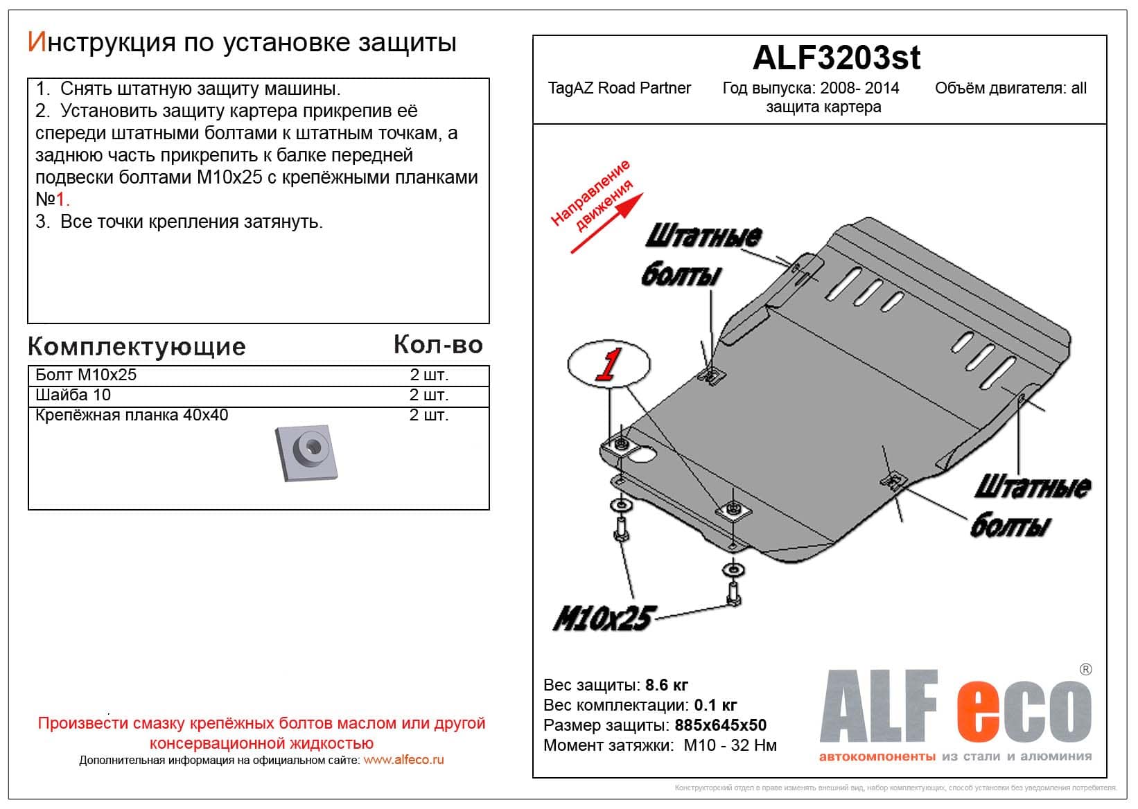 Защита картера ALFeco арт. ALF3203al изготовлена из алюминия толщиной 4мм специально для автомобиля TagAZ Road Partner 2008-2014. Обеспечивает надежную защиту агрегатов от механических повреждений и попадания дорожной грязи и других предметов, встречающихся на проезжей части, способных зачастую нанести серьезный вред автомобилю. В комплекте идет весь необходимый крепеж для установки. Наличие можно уточнить по телефону. Возможна установка в нашем автосервисе по предварительной записи