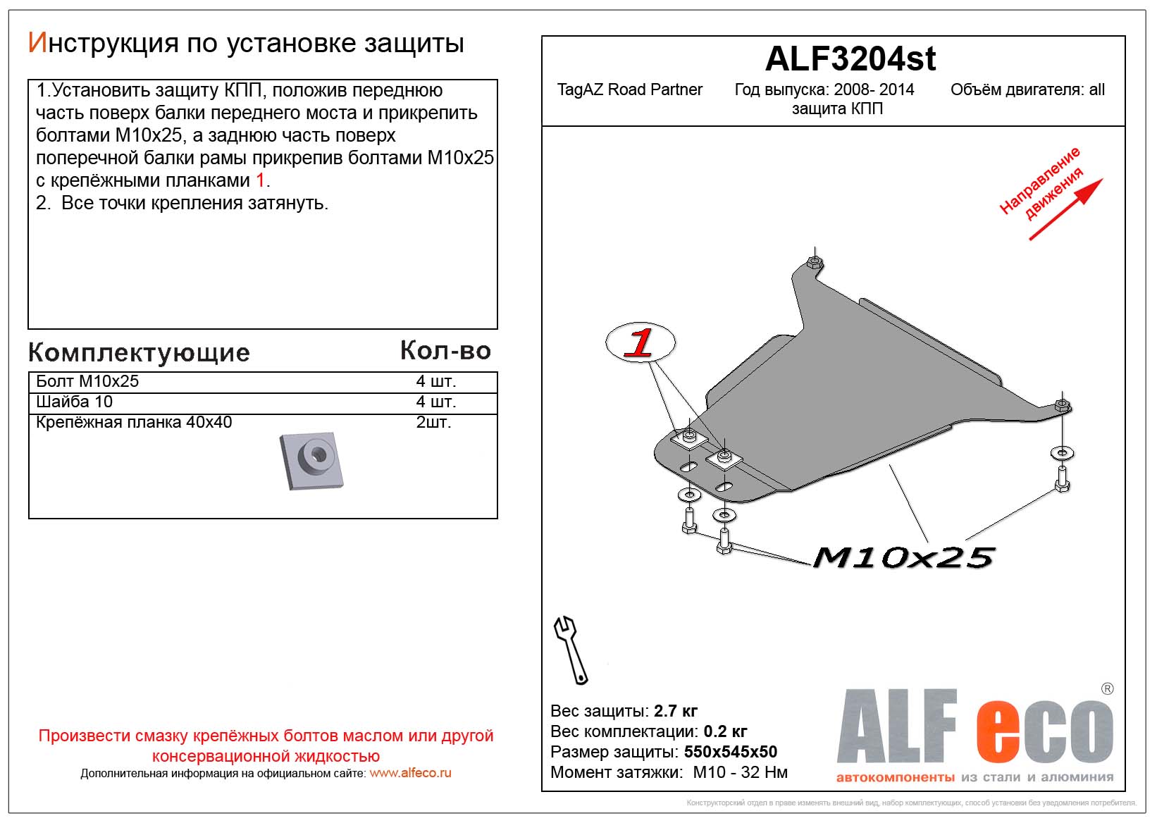 Защита КПП ALFeco арт. ALF3204al изготовлена из алюминия толщиной 4мм специально для автомобиля TagAZ Road Partner 2008-2014. Обеспечивает надежную защиту агрегатов от механических повреждений и попадания дорожной грязи и других предметов, встречающихся на проезжей части, способных зачастую нанести серьезный вред автомобилю. В комплекте идет весь необходимый крепеж для установки. Наличие можно уточнить по телефону. Возможна установка в нашем автосервисе по предварительной записи