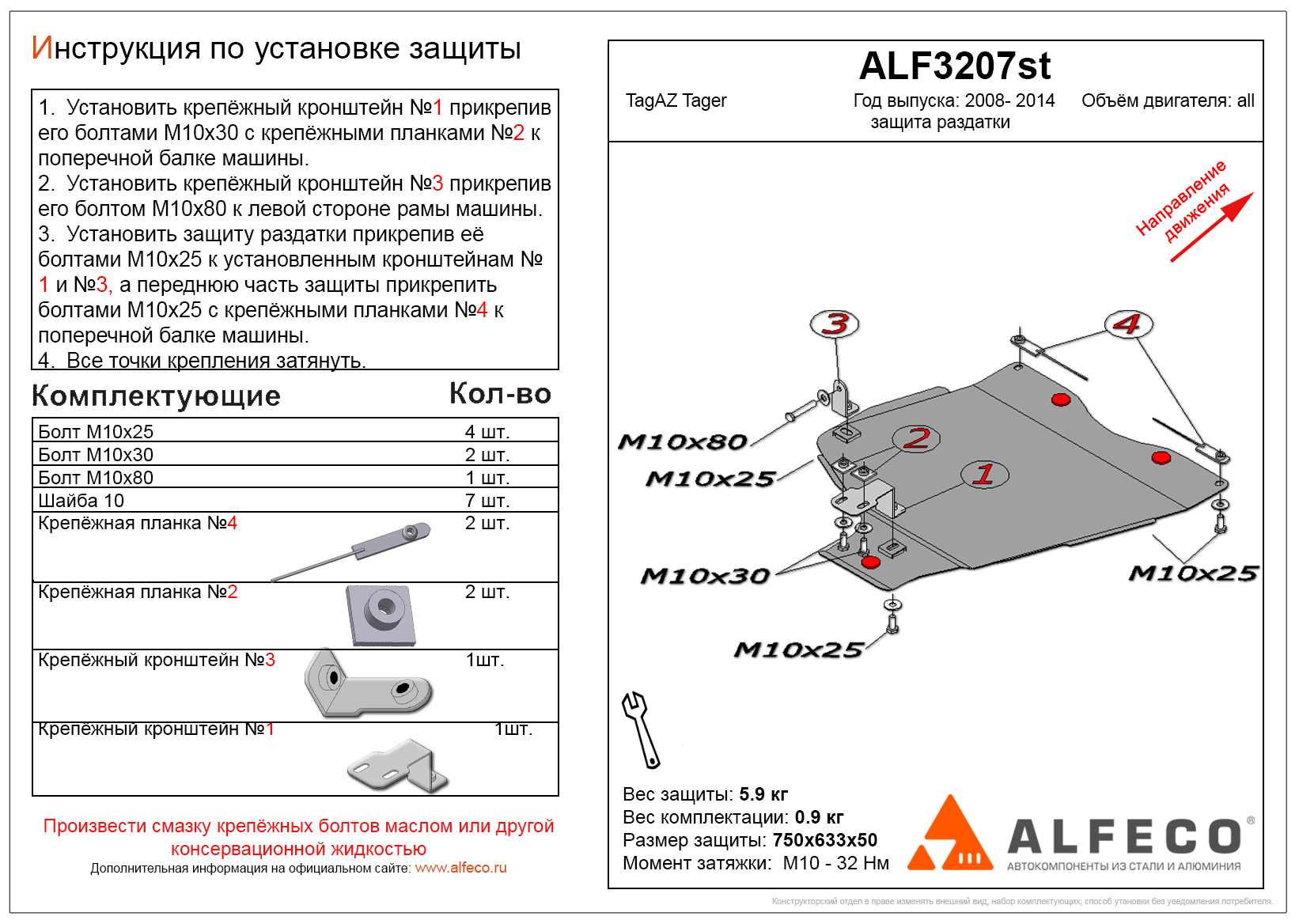 Защита РК ALFeco арт. ALF3207al изготовлена из алюминия толщиной 4мм специально для автомобиля TagAZ Tager 2008-2014. Обеспечивает надежную защиту агрегатов от механических повреждений и попадания дорожной грязи и других предметов, встречающихся на проезжей части, способных зачастую нанести серьезный вред автомобилю.