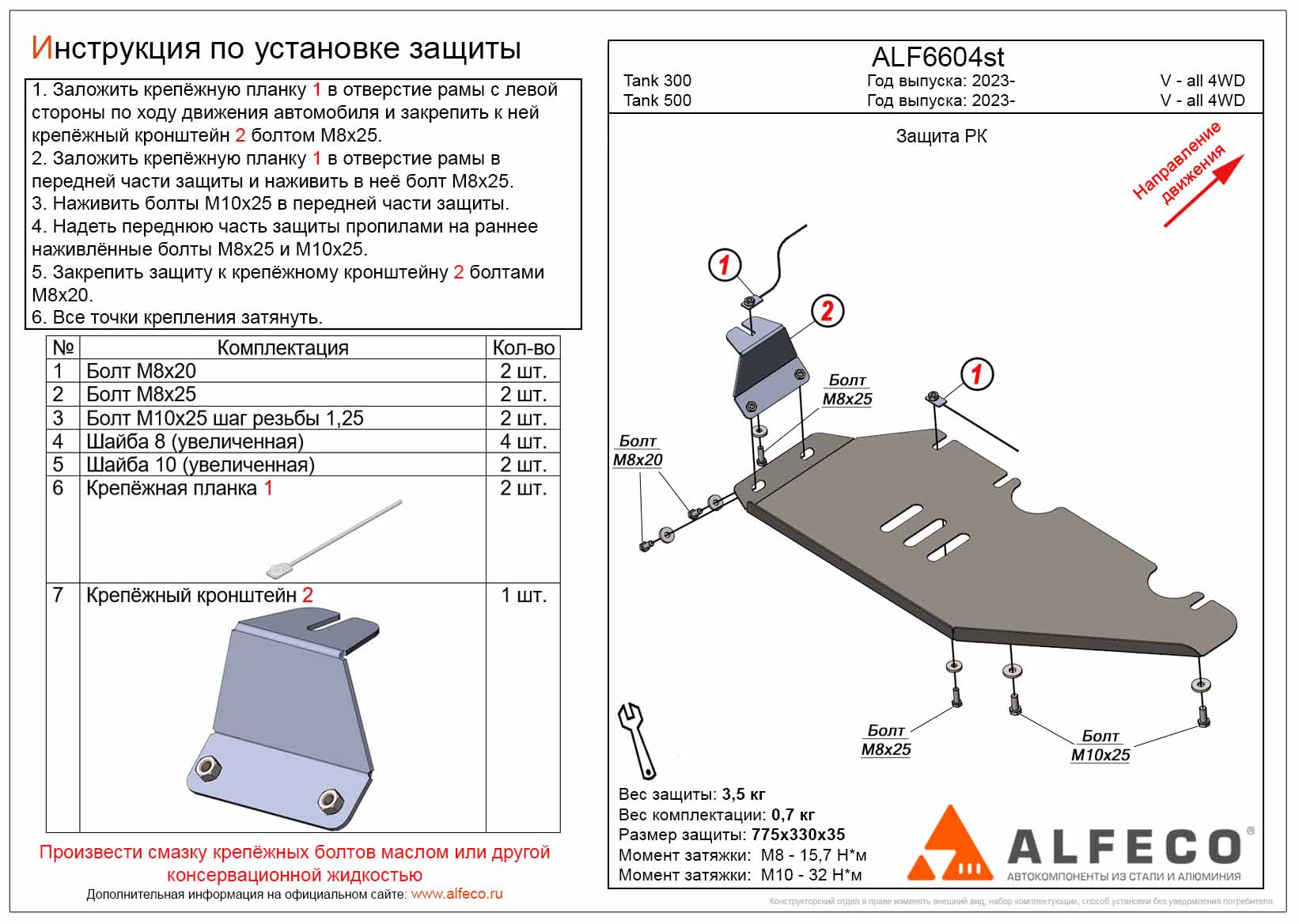 Защита редуктора переднего моста Tank 500 2023- V-all 4WD , ALFeco, сталь 2мм, арт. ALF6602st