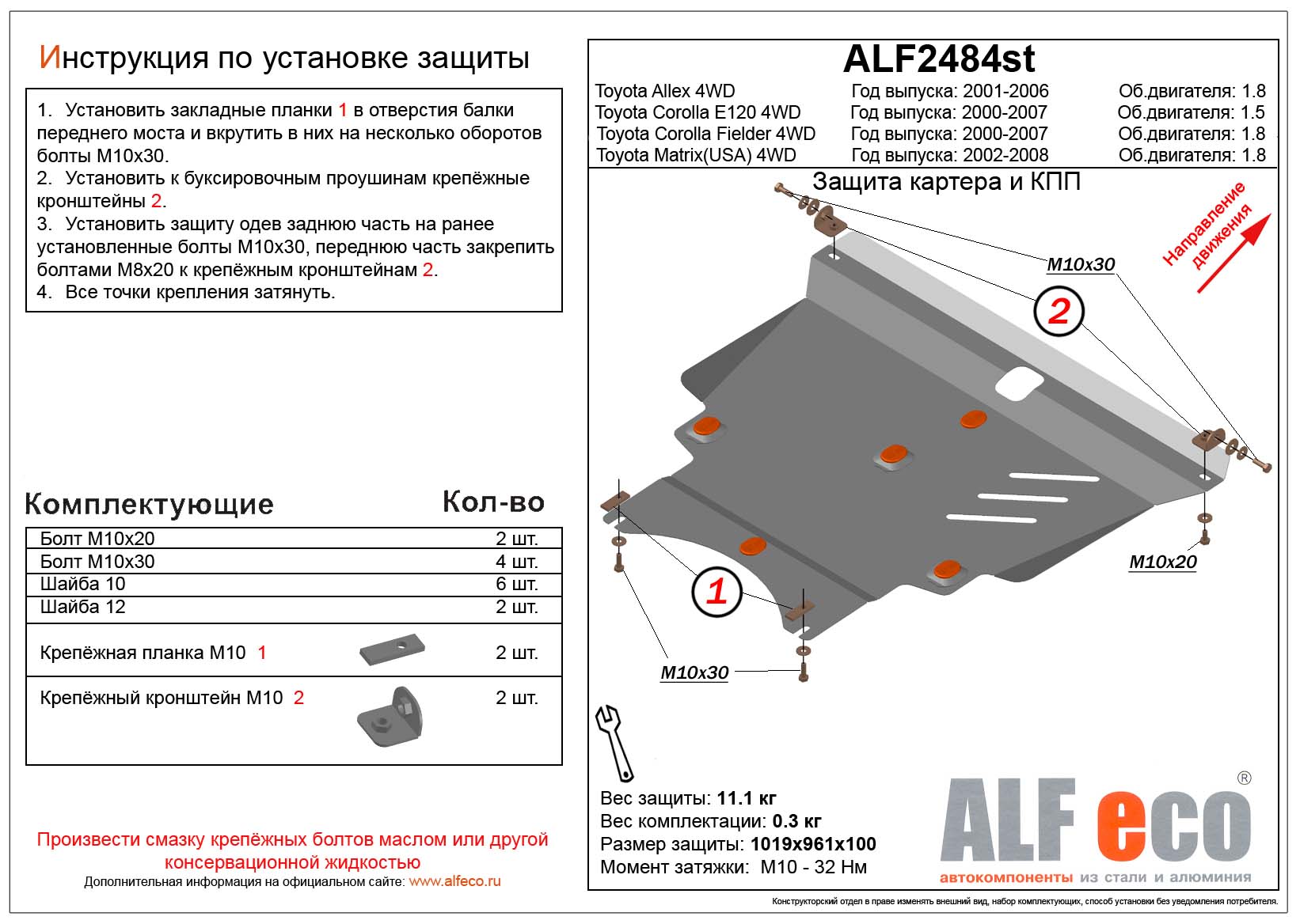 Защита картера и КПП ALFeco арт. ALF2484st изготовлена из стали толщиной 2мм специально для автомобиля Toyota Allex 2001-2006. Обеспечивает надежную защиту агрегатов от механических повреждений и попадания дорожной грязи и других предметов, встречающихся на проезжей части, способных зачастую нанести серьезный вред автомобилю. В комплекте идет весь необходимый крепеж для установки. Наличие можно уточнить по телефону. Возможна установка в нашем автосервисе по предварительной записи