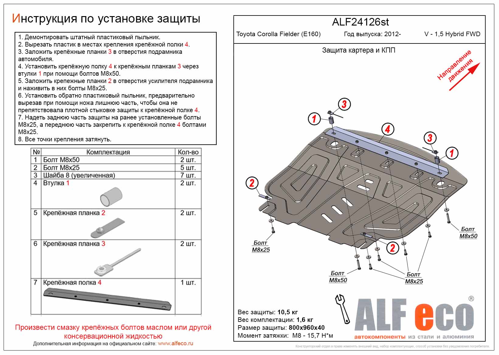Защита картера и КПП ALFeco арт. ALF24126st изготовлена из стали толщиной 2мм специально для автомобиля Toyota Succeed 2014-2020. Обеспечивает надежную защиту агрегатов от механических повреждений и попадания дорожной грязи и других предметов, встречающихся на проезжей части, способных зачастую нанести серьезный вред автомобилю. В комплекте идет весь необходимый крепеж для установки. Наличие можно уточнить по телефону. Возможна установка в нашем автосервисе по предварительной записи