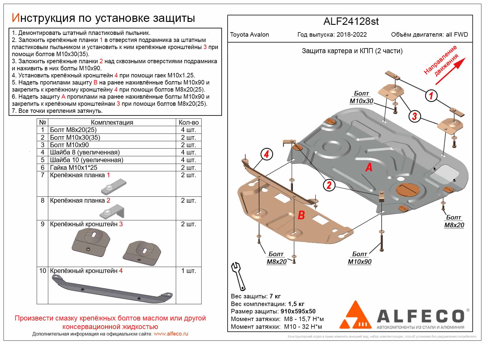 Защита картера и КПП (2 части) ALFeco арт. ALF24128al изготовлена из алюминия толщиной 4мм специально для автомобиля Toyota Camry (XV80) 2023- . Обеспечивает надежную защиту агрегатов от механических повреждений и попадания дорожной грязи и других предметов, встречающихся на проезжей части, способных зачастую нанести серьезный вред автомобилю.