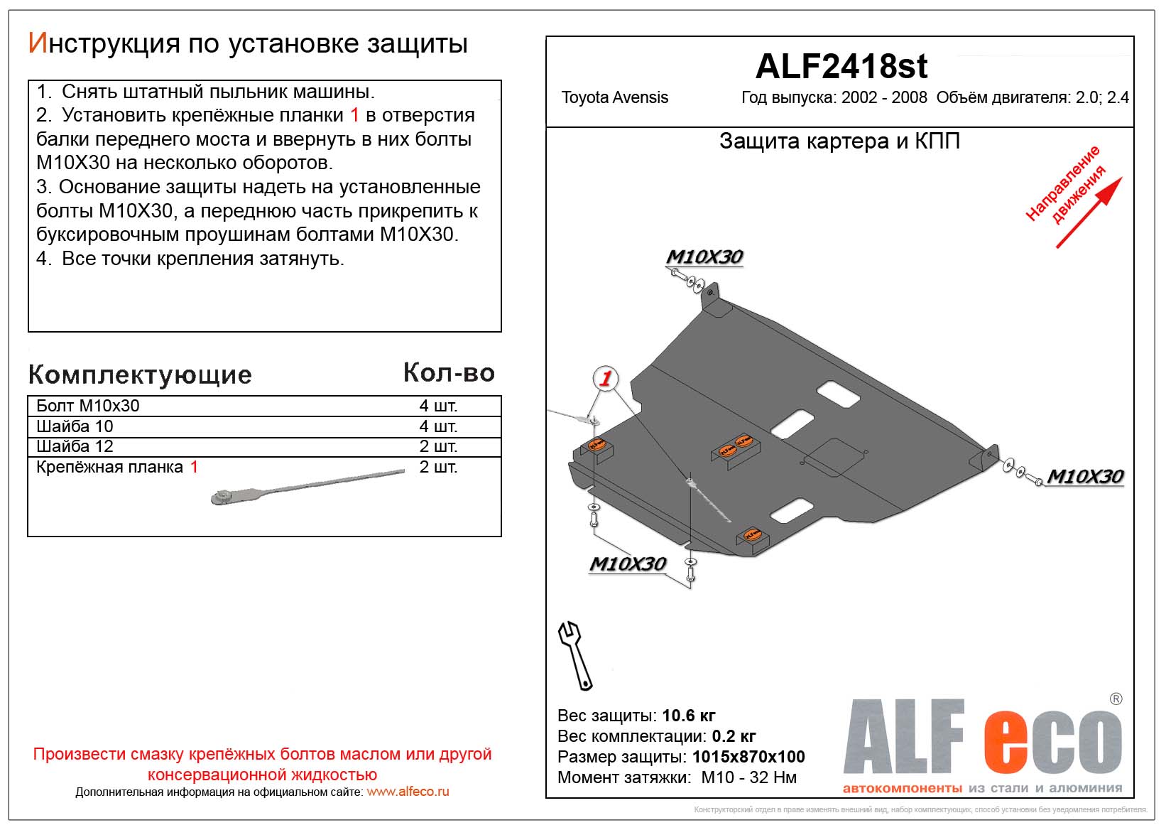 Защита картера и КПП ALFeco арт. ALF2418st изготовлена из стали толщиной 2мм специально для автомобиля Toyota Avensis (T250) 2002-2008. Обеспечивает надежную защиту агрегатов от механических повреждений и попадания дорожной грязи и других предметов, встречающихся на проезжей части, способных зачастую нанести серьезный вред автомобилю. В комплекте идет весь необходимый крепеж для установки. Наличие можно уточнить по телефону. Возможна установка в нашем автосервисе по предварительной записи