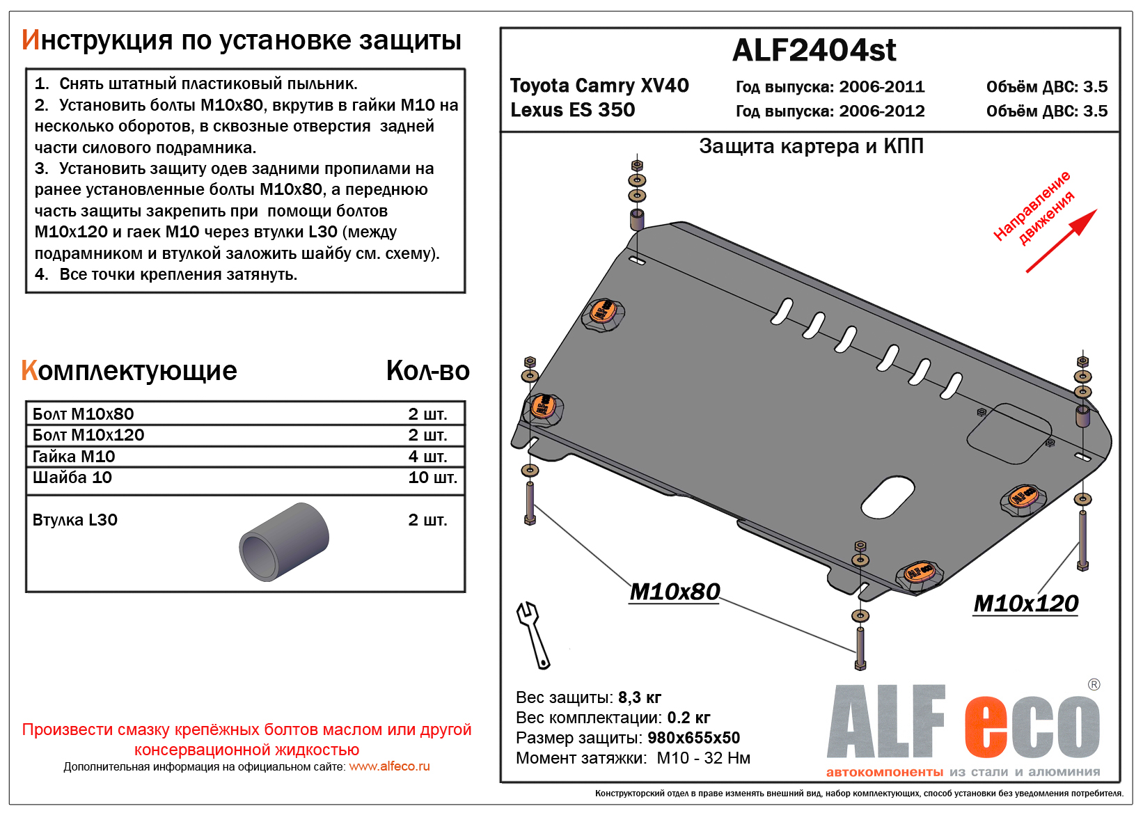 Защита картера и КПП ALFeco арт. ALF2403al изготовлена из алюминия толщиной 4мм специально для автомобиля Toyota Camry (XV40) 2006-2011. Обеспечивает надежную защиту агрегатов от механических повреждений и попадания дорожной грязи и других предметов, встречающихся на проезжей части, способных зачастую нанести серьезный вред автомобилю. В комплекте идет весь необходимый крепеж для установки. Наличие можно уточнить по телефону. Возможна установка в нашем автосервисе по предварительной записи