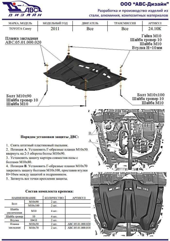 - Официальный представитель: Мы являемся официальными представителями АВС-Дизайн и предлагаем лучшие условия и низкие цены на защиту картера двигателя и КПП для Toyota Camry VII (XV50) 2017-2018 .