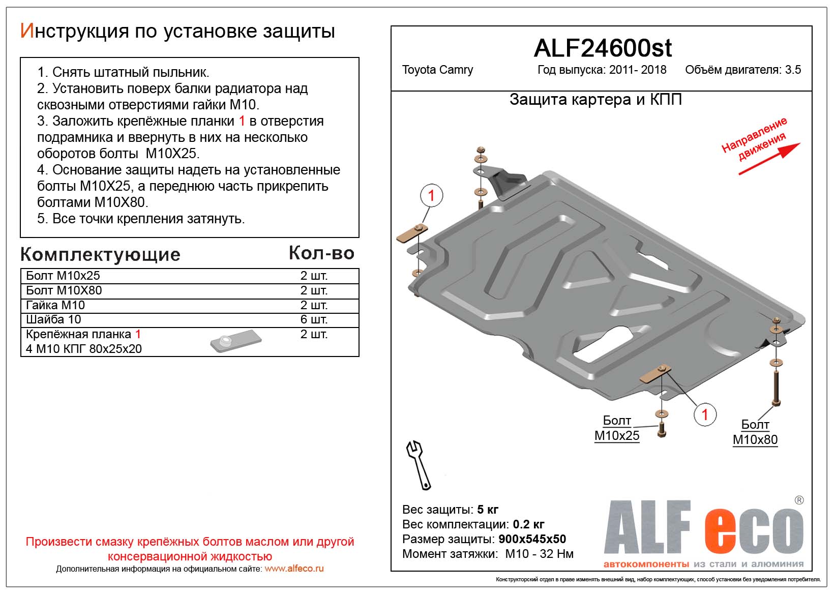 Защита картера и КПП (1,5 мм) ALFeco арт. ALF24600al изготовлена из алюминия толщиной 4мм специально для автомобиля Toyota Camry (XV50) 2011-2018. Обеспечивает надежную защиту агрегатов от механических повреждений и попадания дорожной грязи и других предметов, встречающихся на проезжей части, способных зачастую нанести серьезный вред автомобилю. В комплекте идет весь необходимый крепеж для установки. Наличие можно уточнить по телефону. Возможна установка в нашем автосервисе по предварительной записи
