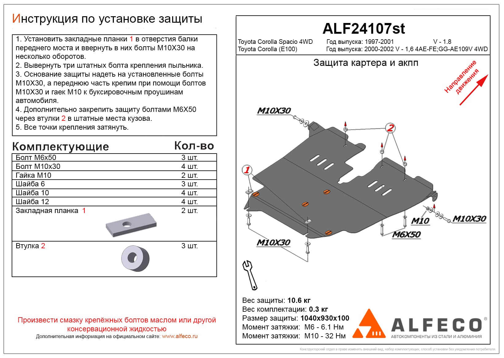 Защита картера и АКПП ALFeco арт. ALF24107st-1 изготовлена из стали толщиной 2 мм специально для автомобиля Toyota Corollа (E100) 2000-2002 . Обеспечивает надежную защиту агрегатов от механических повреждений и попадания дорожной грязи и других предметов, встречающихся на проезжей части, способных зачастую нанести серьезный вред автомобилю. В комплекте идет весь необходимый крепеж для установки. Наличие можно уточнить по телефону. Возможна установка в нашем автосервисе по предварительной записи