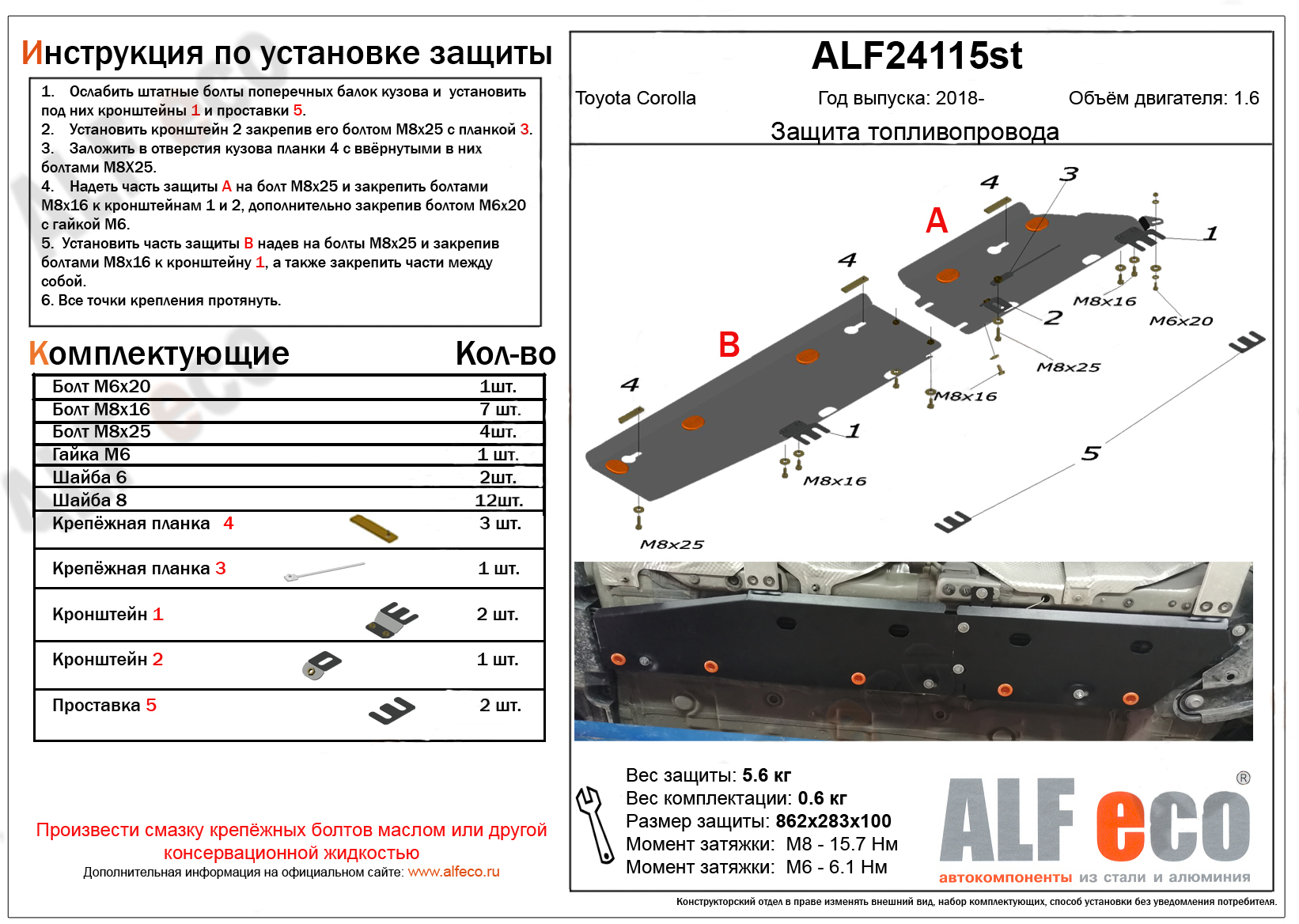 Защита топливопровода (2 части) ALFeco арт. ALF24115st изготовлена из стали толщиной 2мм специально для автомобиля Toyota Corolla (E210) 2018-. Обеспечивает надежную защиту агрегатов от механических повреждений и попадания дорожной грязи и других предметов, встречающихся на проезжей части, способных зачастую нанести серьезный вред автомобилю. В комплекте идет весь необходимый крепеж для установки. Наличие можно уточнить по телефону. Возможна установка в нашем автосервисе по предварительной записи