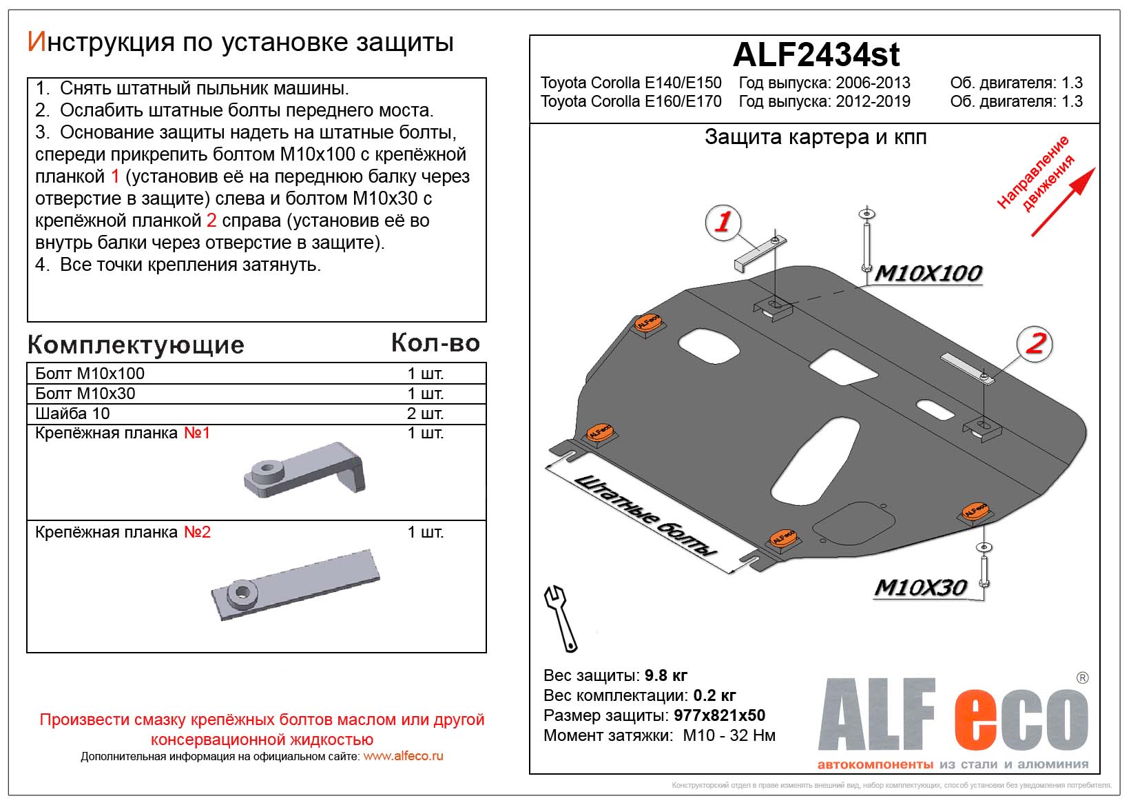 Защита картера и КПП ALFeco арт. ALF2434al-1 изготовлена из алюминия толщиной 4мм специально для автомобиля Toyota Corolla (E160/E170) 2012-2019. Обеспечивает надежную защиту агрегатов от механических повреждений и попадания дорожной грязи и других предметов, встречающихся на проезжей части, способных зачастую нанести серьезный вред автомобилю. В комплекте идет весь необходимый крепеж для установки. Наличие можно уточнить по телефону. Возможна установка в нашем автосервисе по предварительной записи