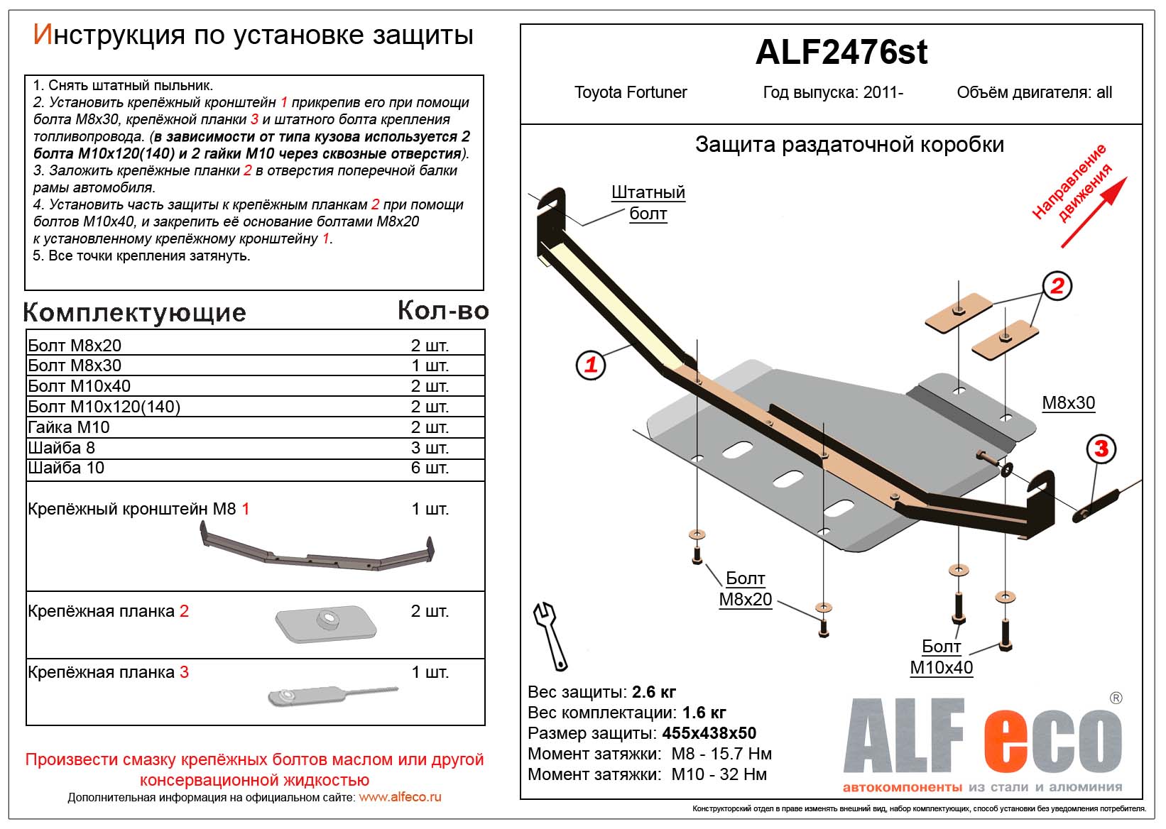 Защита РК ALFeco арт. ALF2476st-1 изготовлена из стали толщиной 2мм специально для автомобиля Toyota Fortuner 2015- (AN160). Обеспечивает надежную защиту агрегатов от механических повреждений и попадания дорожной грязи и других предметов, встречающихся на проезжей части, способных зачастую нанести серьезный вред автомобилю. В комплекте идет весь необходимый крепеж для установки. Наличие можно уточнить по телефону. Возможна установка в нашем автосервисе по предварительной записи