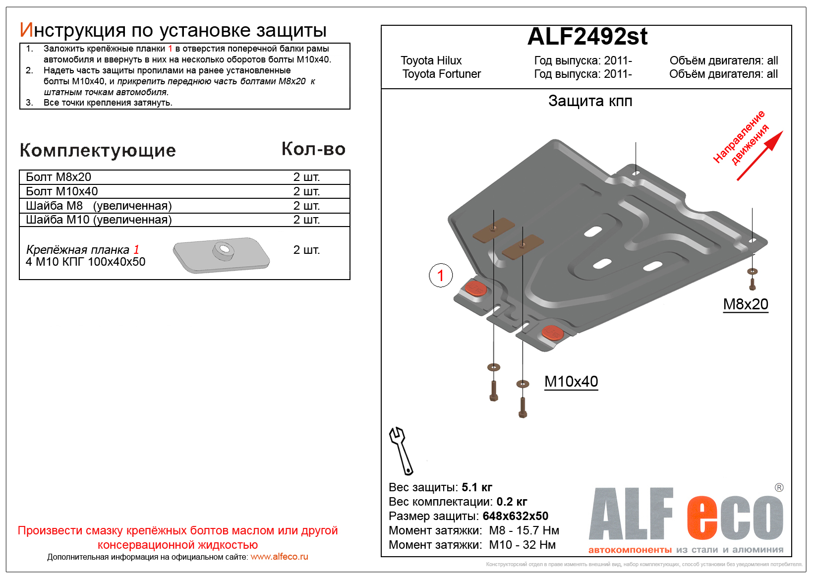 Защита КПП ALFeco арт. ALF2492st-2 изготовлена из стали толщиной 2мм специально для автомобиля Toyota Fortuner 2015- (AN160). Обеспечивает надежную защиту агрегатов от механических повреждений и попадания дорожной грязи и других предметов, встречающихся на проезжей части, способных зачастую нанести серьезный вред автомобилю. В комплекте идет весь необходимый крепеж для установки. Наличие можно уточнить по телефону. Возможна установка в нашем автосервисе по предварительной записи
