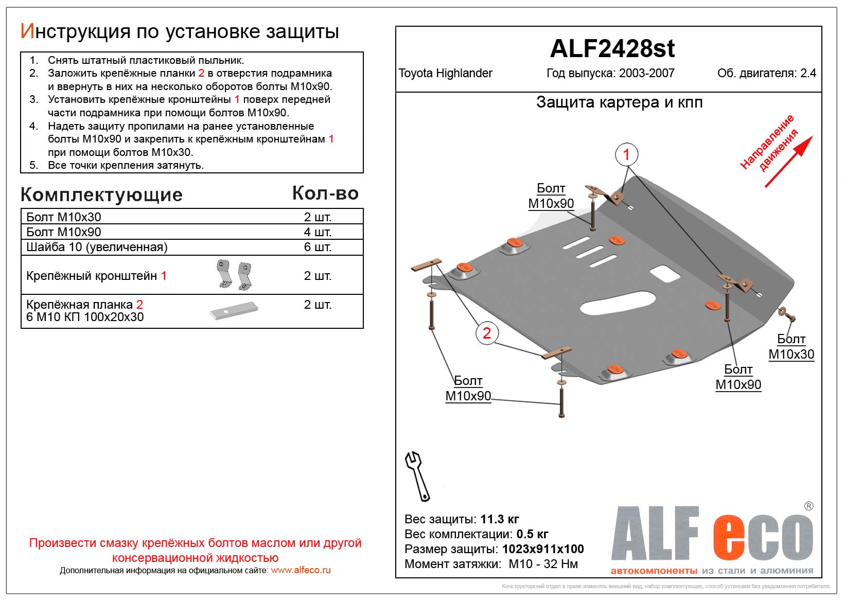 Защита картера и КПП ALFeco арт. ALF2428st изготовлена из стали толщиной 2мм специально для автомобиля Toyota Highlander (XU20) 2003-2007. Обеспечивает надежную защиту агрегатов от механических повреждений и попадания дорожной грязи и других предметов, встречающихся на проезжей части, способных зачастую нанести серьезный вред автомобилю. В комплекте идет весь необходимый крепеж для установки. Наличие можно уточнить по телефону. Возможна установка в нашем автосервисе по предварительной записи