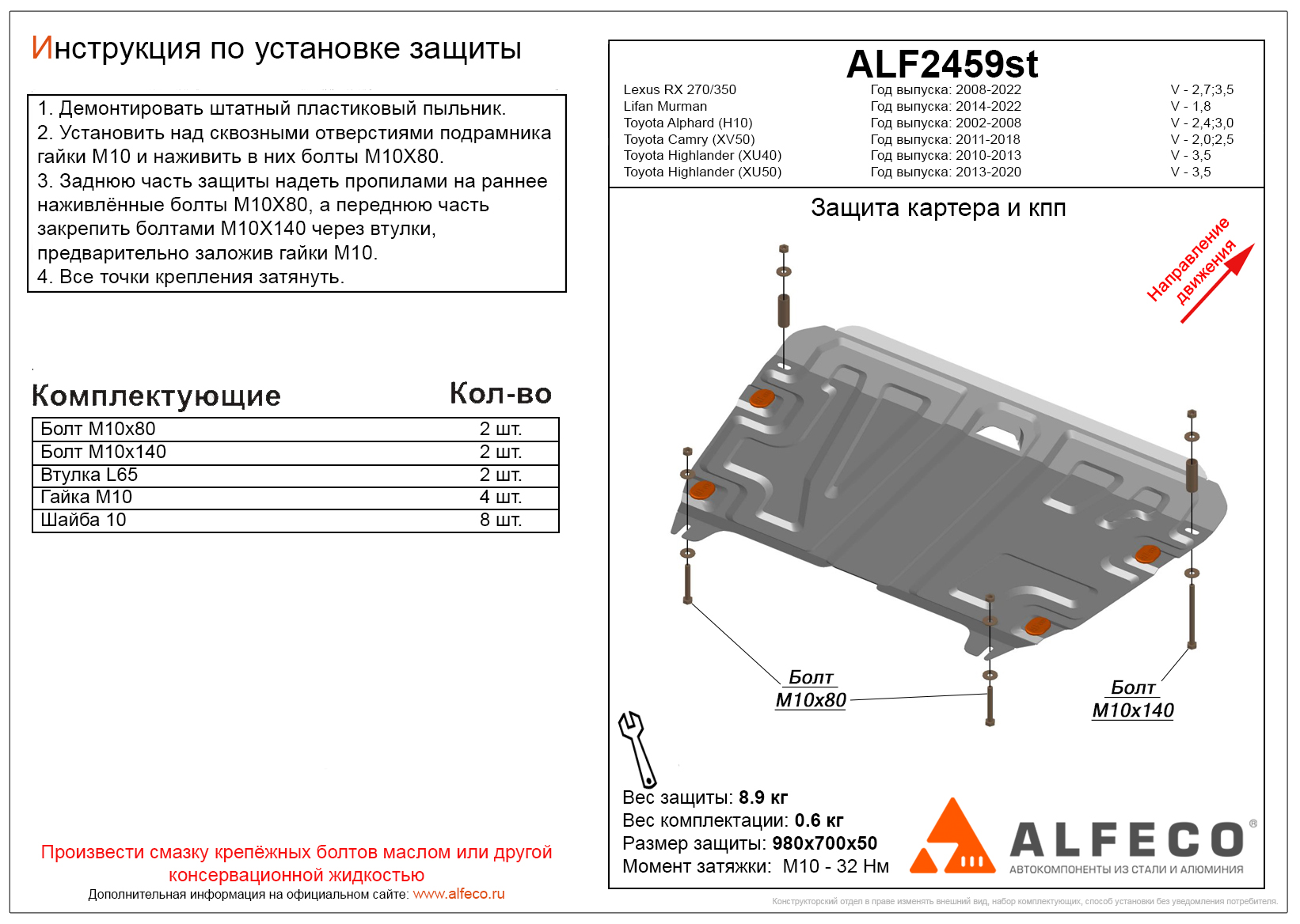 Защита картера и КПП ALFeco арт. ALF2459st-5 изготовлена из стали толщиной 2мм специально для автомобиля Toyota Highlander (XU50) 2013-2020. Обеспечивает надежную защиту агрегатов от механических повреждений и попадания дорожной грязи и других предметов, встречающихся на проезжей части, способных зачастую нанести серьезный вред автомобилю.