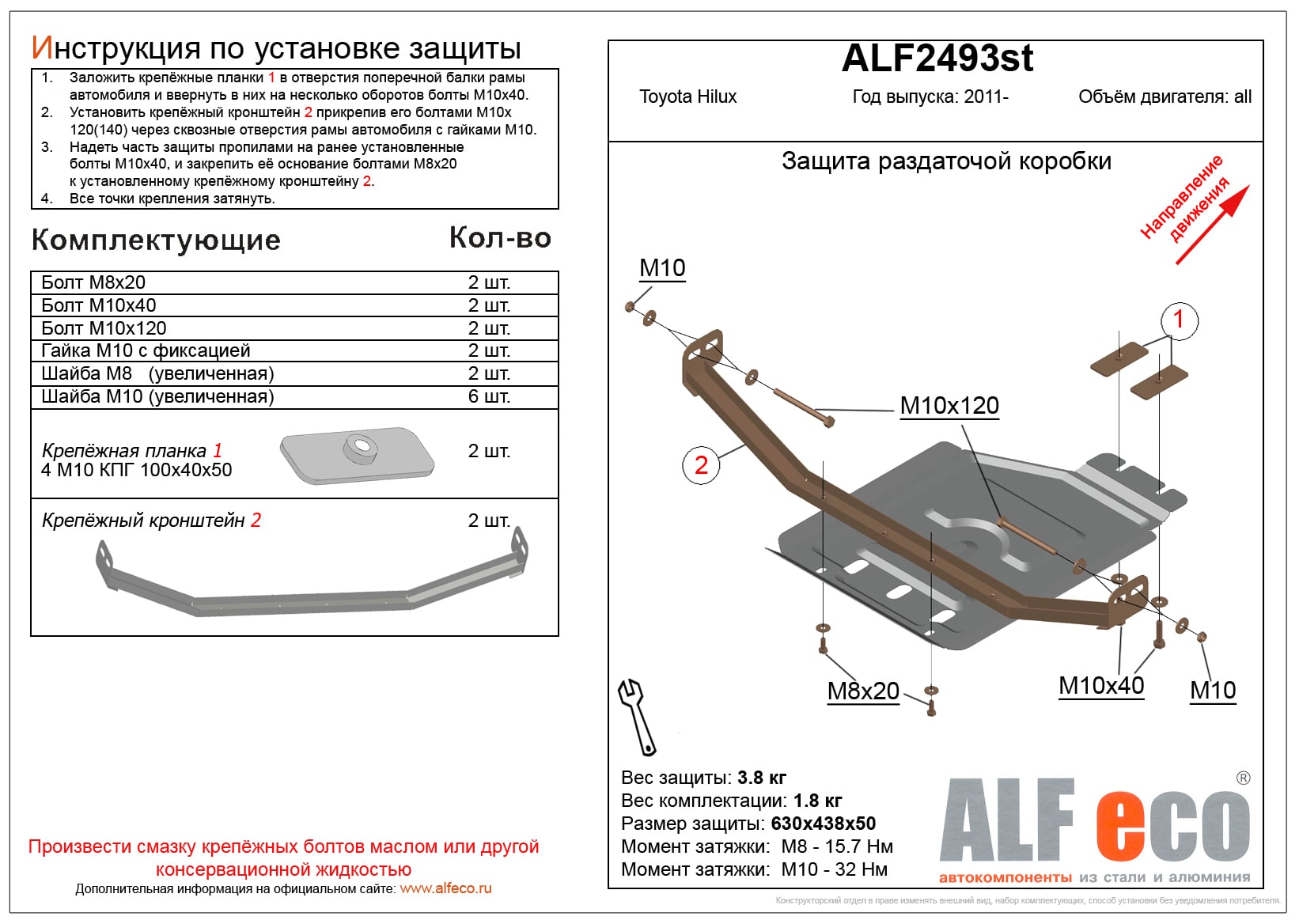 Защита РК ALFeco арт. ALF2493al изготовлена из алюминия толщиной 4мм специально для автомобиля Toyota Hilux (AN20;AN30) 2011-2015. Обеспечивает надежную защиту агрегатов от механических повреждений и попадания дорожной грязи и других предметов, встречающихся на проезжей части, способных зачастую нанести серьезный вред автомобилю. В комплекте идет весь необходимый крепеж для установки. Наличие можно уточнить по телефону. Возможна установка в нашем автосервисе по предварительной записи
