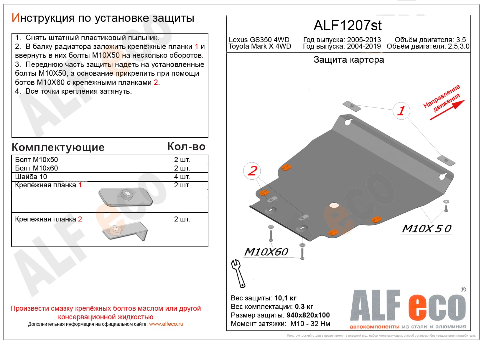 Защита картера (установка защиты на пыльник) ALFeco арт. ALF1207st-1 изготовлена из стали толщиной 2мм специально для автомобиля Toyota Mark X (X120) 2004-2009. Обеспечивает надежную защиту агрегатов от механических повреждений и попадания дорожной грязи и других предметов, встречающихся на проезжей части, способных зачастую нанести серьезный вред автомобилю. В комплекте идет весь необходимый крепеж для установки. Наличие можно уточнить по телефону. Возможна установка в нашем автосервисе по предварительной записи