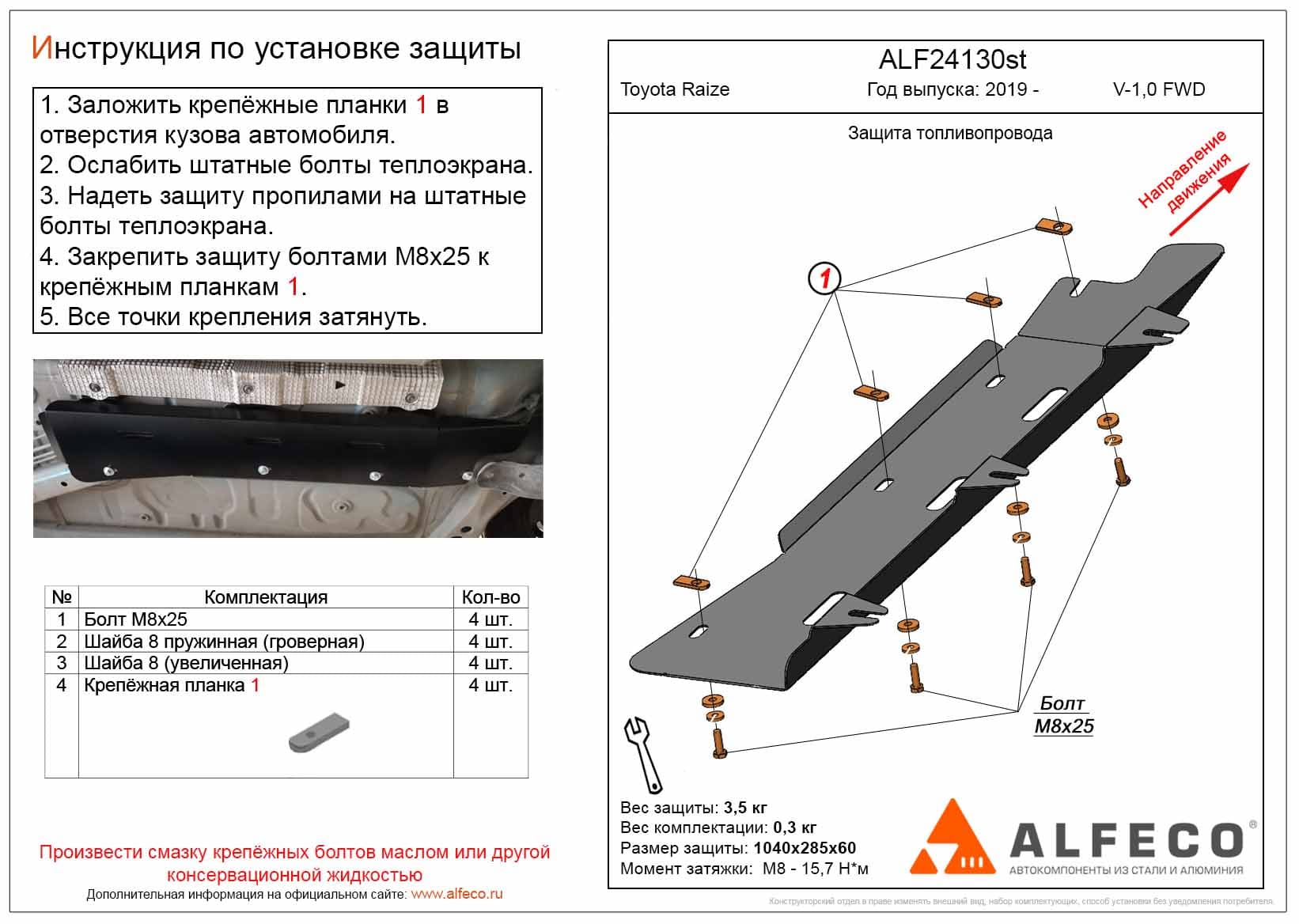 Защита топливопровода ALFeco арт. ALF24130st изготовлена из стали толщиной 2мм специально для автомобиля Toyota Raize 2019-. Обеспечивает надежную защиту агрегатов от механических повреждений и попадания дорожной грязи и других предметов, встречающихся на проезжей части, способных зачастую нанести серьезный вред автомобилю. В комплекте идет весь необходимый крепеж для установки. Наличие можно уточнить по телефону. Возможна установка в нашем автосервисе по предварительной записи
