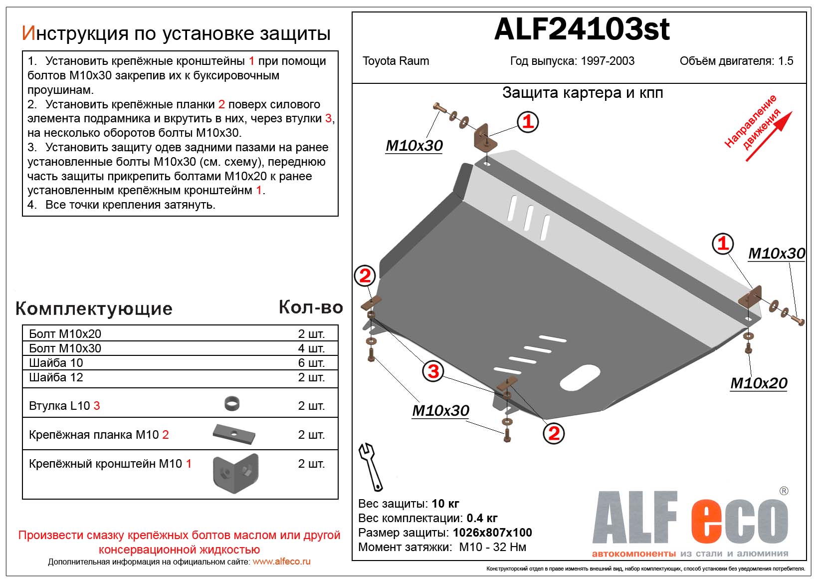 Защита картера и КПП ALFeco арт. ALF24103st изготовлена из стали толщиной 2мм специально для автомобиля Toyota Raum (Z10) 1997-2003. Обеспечивает надежную защиту агрегатов от механических повреждений и попадания дорожной грязи и других предметов, встречающихся на проезжей части, способных зачастую нанести серьезный вред автомобилю. В комплекте идет весь необходимый крепеж для установки. Наличие можно уточнить по телефону. Возможна установка в нашем автосервисе по предварительной записи