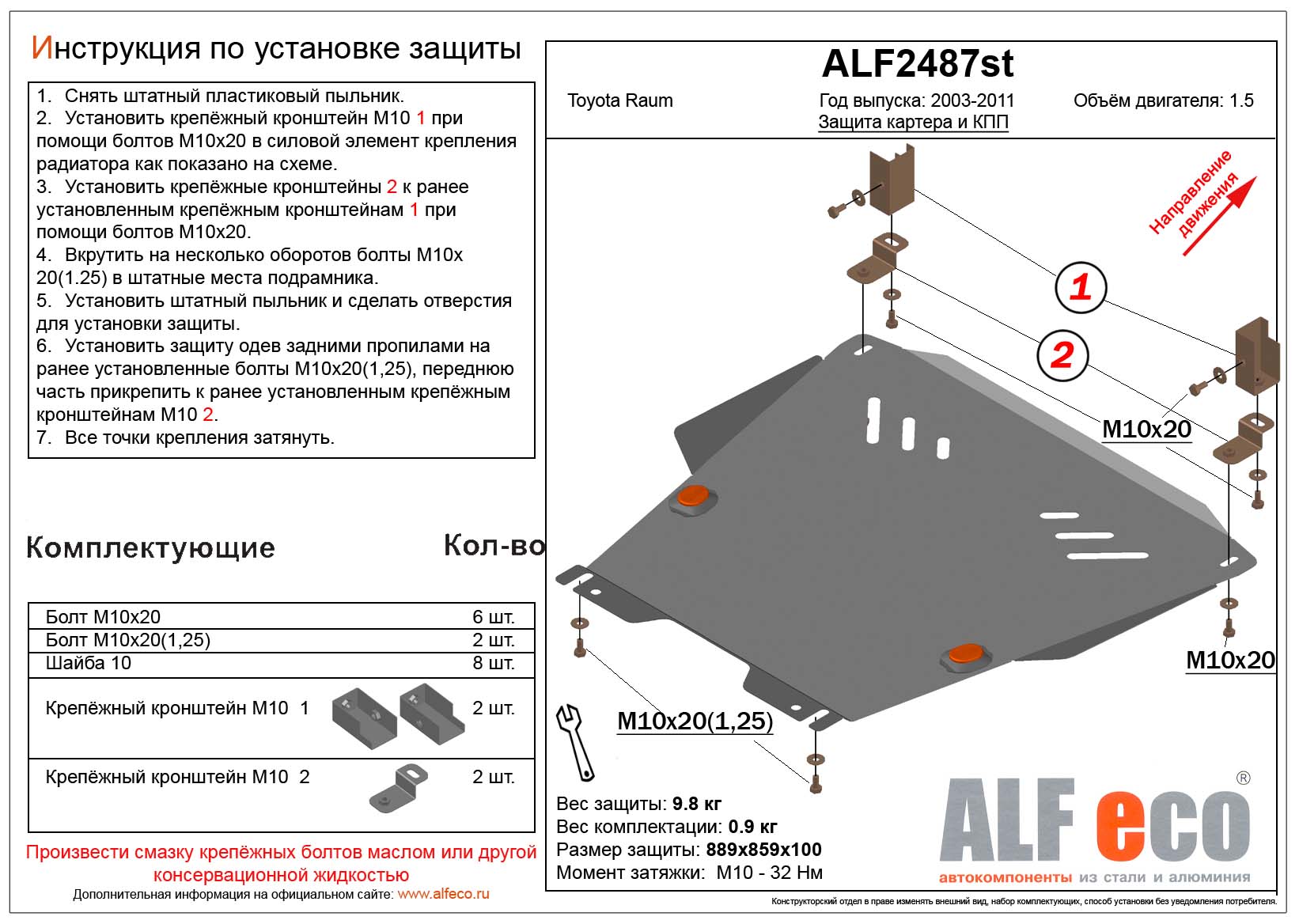 Защита картера и КПП ALFeco арт. ALF2487al изготовлена из алюминия толщиной 4мм специально для автомобиля Toyota Raum (Z20) 2003-2011. Обеспечивает надежную защиту агрегатов от механических повреждений и попадания дорожной грязи и других предметов, встречающихся на проезжей части, способных зачастую нанести серьезный вред автомобилю. В комплекте идет весь необходимый крепеж для установки. Наличие можно уточнить по телефону. Возможна установка в нашем автосервисе по предварительной записи