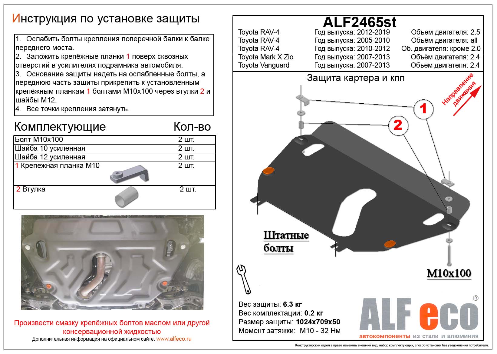 Защита картера и КПП (установка защиты на пыльник) ALFeco арт. ALF2465st-2 изготовлена из стали толщиной 2мм специально для автомобиля Toyota Rav4 III (XA30) 2010-2012. Обеспечивает надежную защиту агрегатов от механических повреждений и попадания дорожной грязи и других предметов, встречающихся на проезжей части, способных зачастую нанести серьезный вред автомобилю.