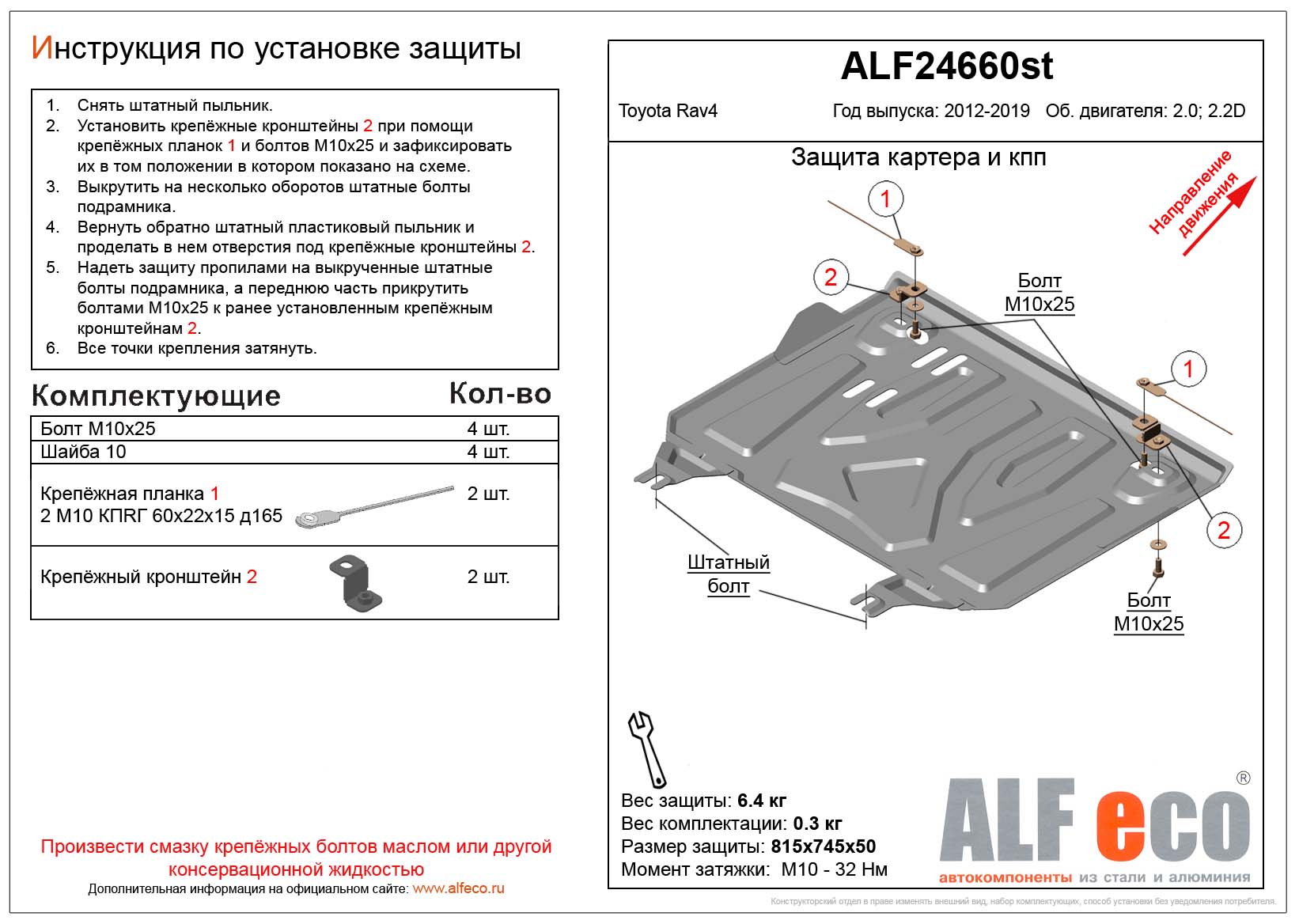 Защита картера и КПП (установка защиты на пыльник) (малая) ALFeco арт. ALF24660st изготовлена из стали толщиной 1.5мм специально для автомобиля Toyota Rav4 IV (XA40) 2012-2019. Обеспечивает надежную защиту агрегатов от механических повреждений и попадания дорожной грязи и других предметов, встречающихся на проезжей части, способных зачастую нанести серьезный вред автомобилю. В комплекте идет весь необходимый крепеж для установки. Наличие можно уточнить по телефону. Возможна установка в нашем автосервисе по предварительной записи