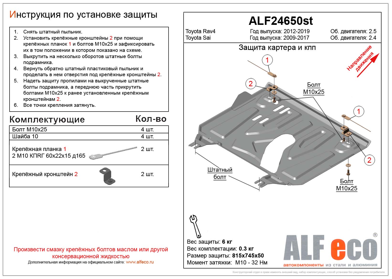 Защита картера и КПП ALFeco арт. ALF24650al-1 изготовлена из алюминия толщиной 4мм специально для автомобиля Toyota Sai 2009-2017. Обеспечивает надежную защиту агрегатов от механических повреждений и попадания дорожной грязи и других предметов, встречающихся на проезжей части, способных зачастую нанести серьезный вред автомобилю. В комплекте идет весь необходимый крепеж для установки. Наличие можно уточнить по телефону. Возможна установка в нашем автосервисе по предварительной записи
