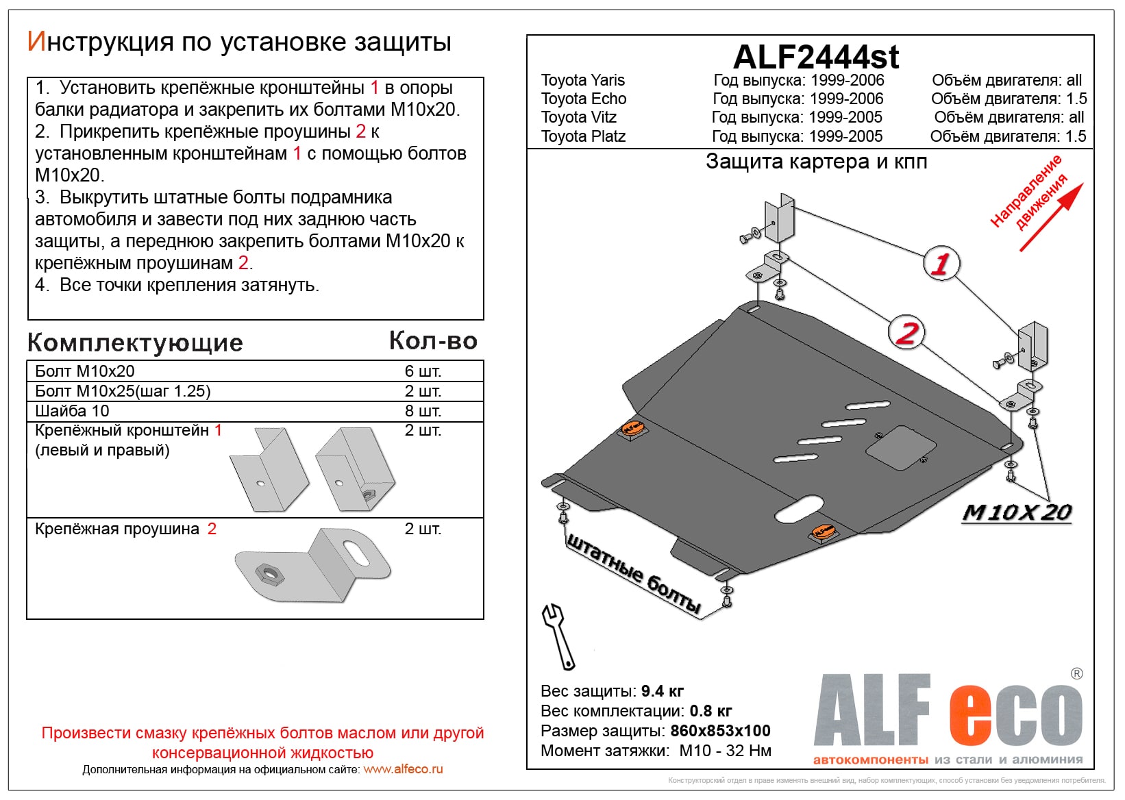Защита картера и КПП ALFeco арт. ALF2444st-3 изготовлена из стали толщиной 2мм специально для автомобиля Toyota Vitz (XP10) 1999-2005. Обеспечивает надежную защиту агрегатов от механических повреждений и попадания дорожной грязи и других предметов, встречающихся на проезжей части, способных зачастую нанести серьезный вред автомобилю.