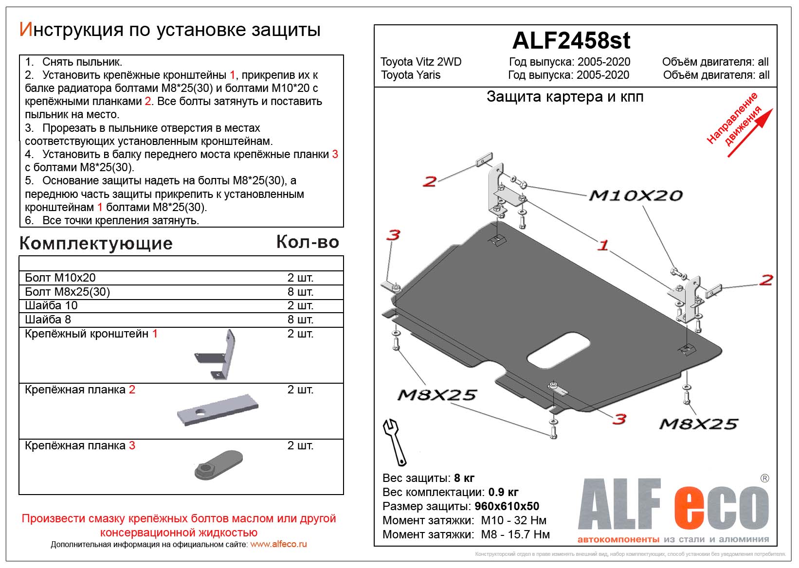 Защита картера и КПП ALFeco арт. ALF2458st изготовлена из стали толщиной 2мм специально для автомобиля Toyota Yaris 2005-2020. Обеспечивает надежную защиту агрегатов от механических повреждений и попадания дорожной грязи и других предметов, встречающихся на проезжей части, способных зачастую нанести серьезный вред автомобилю. В комплекте идет весь необходимый крепеж для установки. Наличие можно уточнить по телефону. Возможна установка в нашем автосервисе по предварительной записи