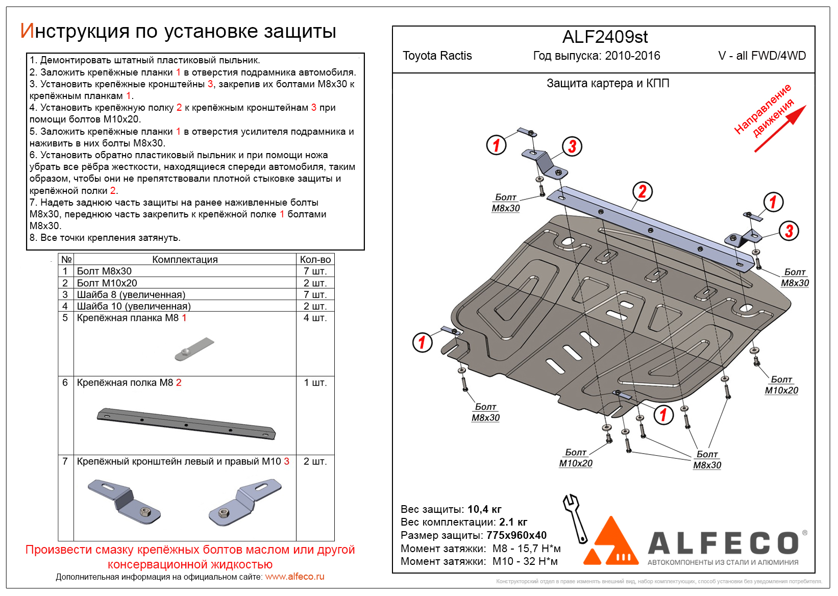 Защита картера и КПП ALFeco арт. ALF2409st изготовлена из стали толщиной 2мм специально для автомобиля Toyota Ractis (P120) 2010-2016. Обеспечивает надежную защиту агрегатов от механических повреждений и попадания дорожной грязи и других предметов, встречающихся на проезжей части, способных зачастую нанести серьезный вред автомобилю.