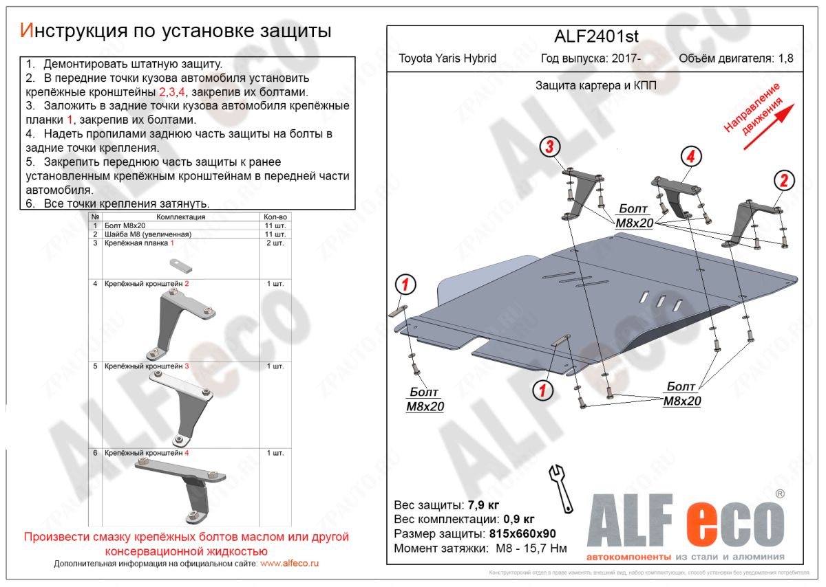 Защита картера и кпп (ALF2401st) Alfeco изготовлена из стали толщиной 2мм специально для автомобиля Toyota Yaris Hybrid 2017- . Данное изделие обеспечивает надежную защиту от механических воздействий, предохраняет подкапотное пространство от попадания грязи и пыли, а также способствует улучшению аэродинамики автомобиля за счет оптимизации обтекаемости моторного отсека снизу.