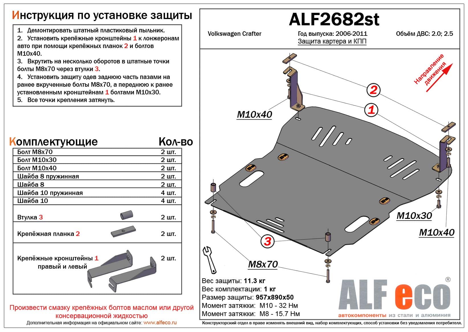 Защита картера и КПП ALFeco арт. ALF2682st изготовлена из стали толщиной 2мм специально для автомобиля Volkswagen Crafter 2006-2011. Обеспечивает надежную защиту агрегатов от механических повреждений и попадания дорожной грязи и других предметов, встречающихся на проезжей части, способных зачастую нанести серьезный вред автомобилю. В комплекте идет весь необходимый крепеж для установки. Наличие можно уточнить по телефону. Возможна установка в нашем автосервисе по предварительной записи