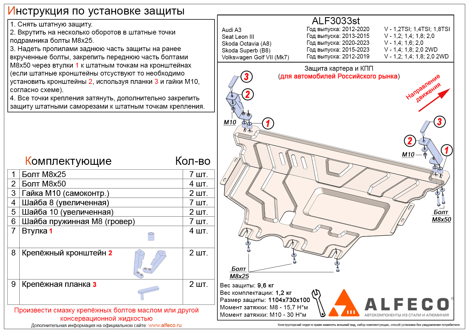 Защита картера и КПП ALFeco арт. ALF3033st-4 изготовлена из стали толщиной 2мм специально для автомобиля Volkswagen Golf VII (Mk7) 2012-2019. Обеспечивает надежную защиту агрегатов от механических повреждений и попадания дорожной грязи и других предметов, встречающихся на проезжей части, способных зачастую нанести серьезный вред автомобилю.