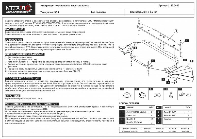 Приобретая стальную защиту 26.0465 для VOLKSWAGEN Passat B5 1996 - 2005, вы можете установить ее в нашем сервисе. Стоимость установки от 1100 рублей за лист, предварительно необходимо записаться по телефону на удобное для вас время.