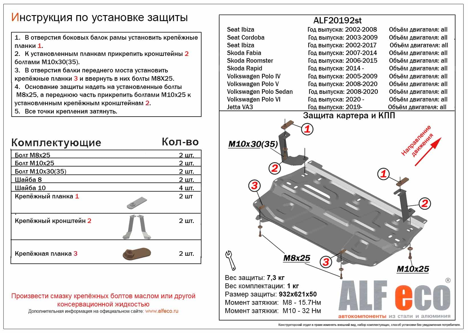 Защита картера и КПП ALFeco арт. ALF20192al-9 изготовлена из алюминия толщиной 4мм специально для автомобиля Volkswagen Polo VI (Mk6) 2020-. Обеспечивает надежную защиту агрегатов от механических повреждений и попадания дорожной грязи и других предметов, встречающихся на проезжей части, способных зачастую нанести серьезный вред автомобилю. В комплекте идет весь необходимый крепеж для установки. Наличие можно уточнить по телефону. Возможна установка в нашем автосервисе по предварительной записи
