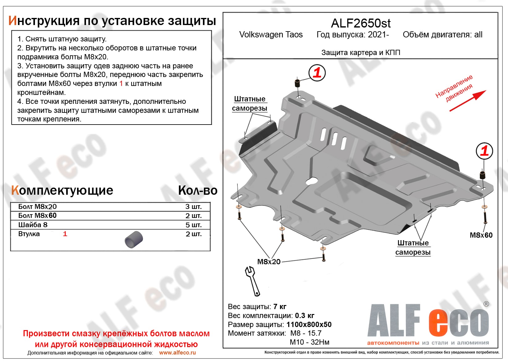 Защита картера и КПП ALFeco арт. ALF2650al изготовлена из алюминия толщиной 4мм специально для автомобиля Volkswagen Taos 2021-. Обеспечивает надежную защиту агрегатов от механических повреждений и попадания дорожной грязи и других предметов, встречающихся на проезжей части, способных зачастую нанести серьезный вред автомобилю.