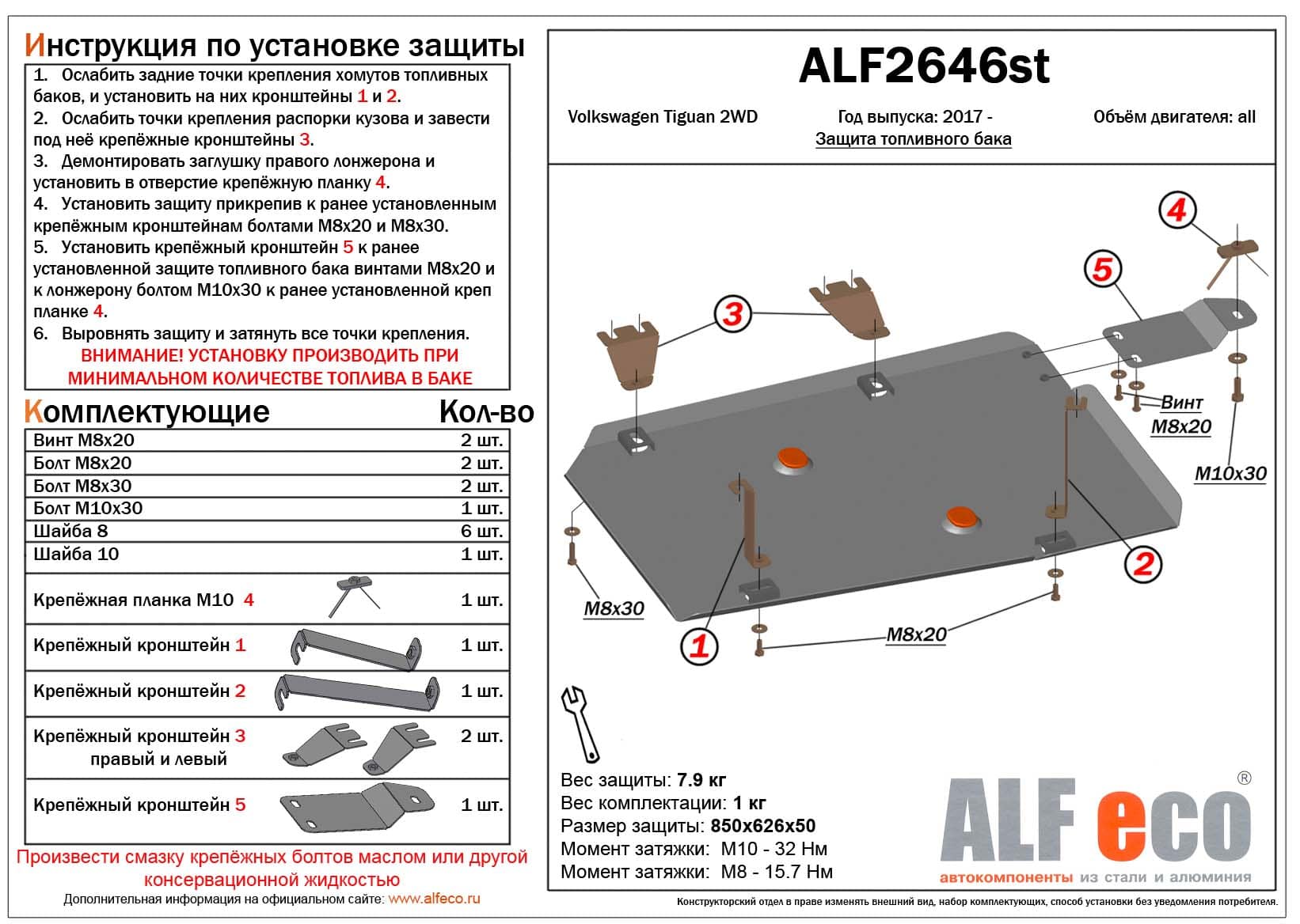 Защита топливного бака ALFeco арт. ALF2646al изготовлена из алюминия толщиной 4мм специально для автомобиля Volkswagen Tiguan (Mk2) 2017-. Обеспечивает надежную защиту агрегатов от механических повреждений и попадания дорожной грязи и других предметов, встречающихся на проезжей части, способных зачастую нанести серьезный вред автомобилю. В комплекте идет весь необходимый крепеж для установки. Наличие можно уточнить по телефону. Возможна установка в нашем автосервисе по предварительной записи