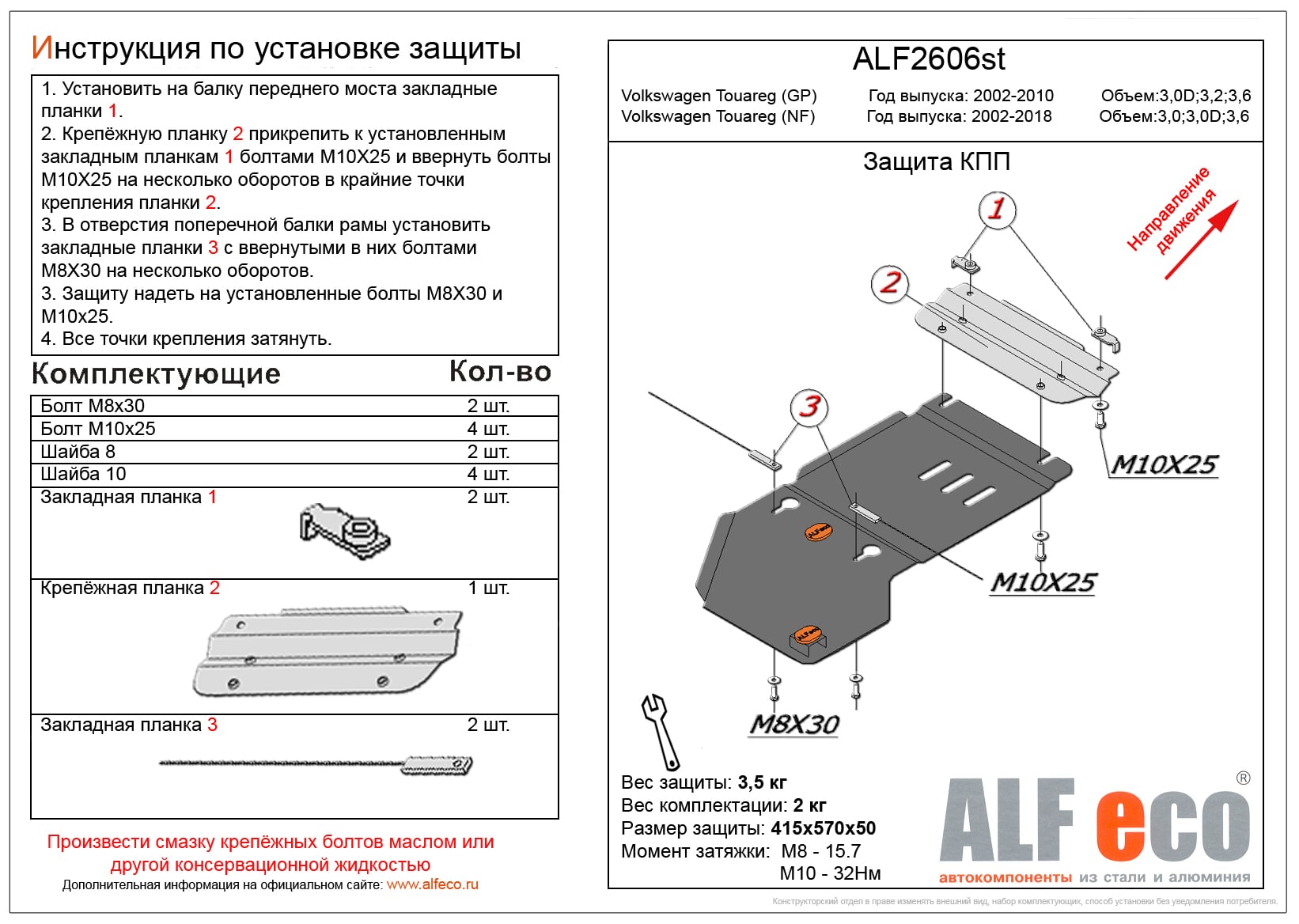 Защита КПП ALFeco арт. ALF2606al-1 изготовлена из алюминия толщиной 4мм специально для автомобиля Volkswagen Touareg (NF) 2010-2018. Обеспечивает надежную защиту агрегатов от механических повреждений и попадания дорожной грязи и других предметов, встречающихся на проезжей части, способных зачастую нанести серьезный вред автомобилю. В комплекте идет весь необходимый крепеж для установки. Наличие можно уточнить по телефону. Возможна установка в нашем автосервисе по предварительной записи