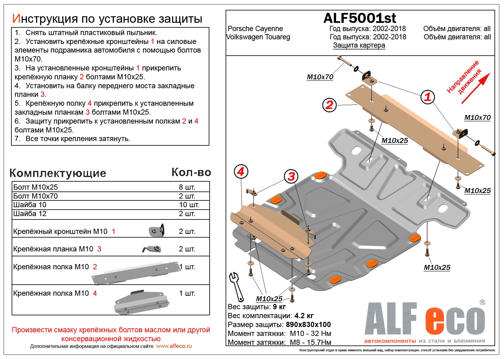 Защита картера ALFeco арт. ALF5001al-2 изготовлена из алюминия толщиной 4мм специально для автомобиля Volkswagen Touareg (NF) 2010-2018. Обеспечивает надежную защиту агрегатов от механических повреждений и попадания дорожной грязи и других предметов, встречающихся на проезжей части, способных зачастую нанести серьезный вред автомобилю.