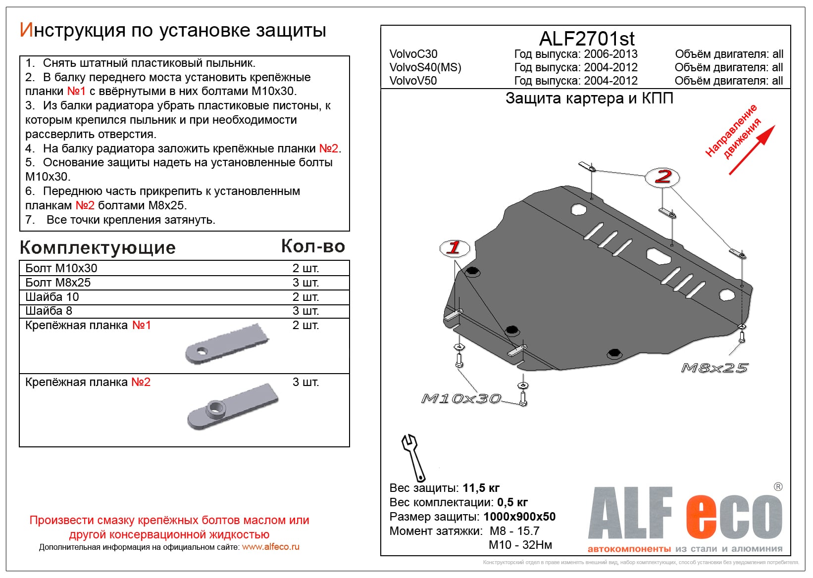 Защита картера и КПП ALFeco арт. ALF2701al-2 изготовлена из алюминия толщиной 4мм специально для автомобиля Volvo V50 2003-2012. Обеспечивает надежную защиту агрегатов от механических повреждений и попадания дорожной грязи и других предметов, встречающихся на проезжей части, способных зачастую нанести серьезный вред автомобилю. В комплекте идет весь необходимый крепеж для установки. Наличие можно уточнить по телефону. Возможна установка в нашем автосервисе по предварительной записи