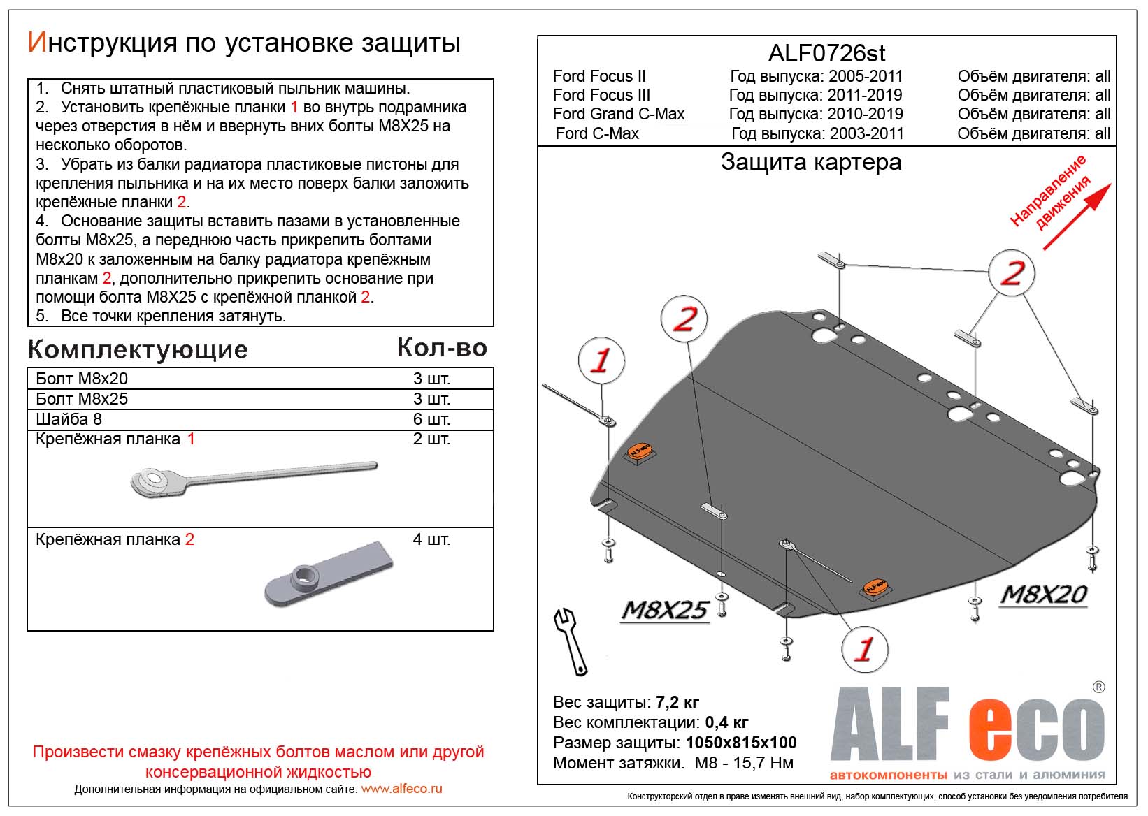Защита картера и КПП (увеличенная) ALFeco арт. ALF0726st изготовлена из стали толщиной 2мм специально для автомобиля Ford Focus II 2005-2011. Обеспечивает надежную защиту агрегатов от механических повреждений и попадания дорожной грязи и других предметов, встречающихся на проезжей части, способных зачастую нанести серьезный вред автомобилю. В комплекте идет весь необходимый крепеж для установки. Наличие можно уточнить по телефону. Возможна установка в нашем автосервисе по предварительной записи